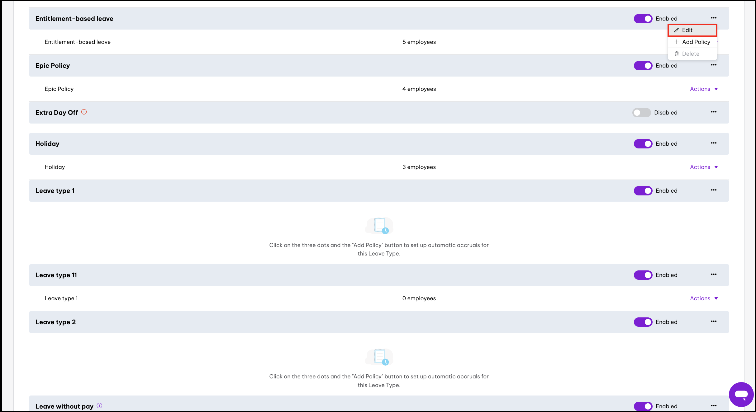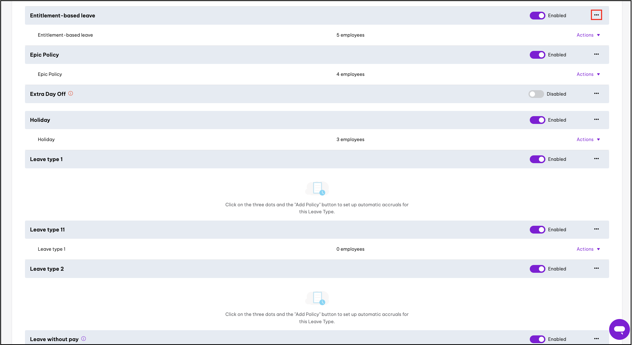 - Find your entitlement-based leave type and click on the 3 dots in the top right-hand corner.