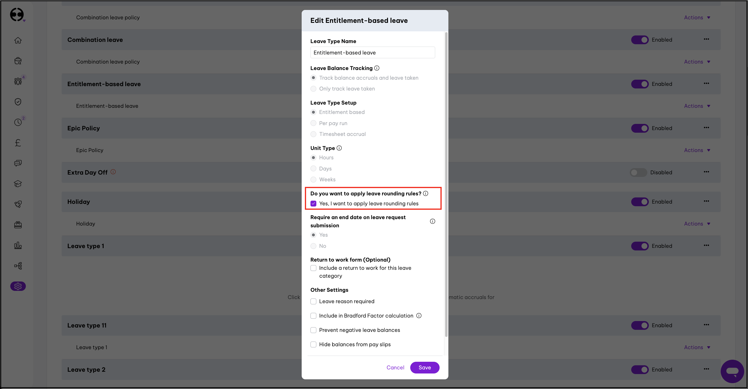 Leave rounding will only work with entitlement-based leave, in hours or days (not weeks), and accrues annually. Carryover leave is not rounded up.