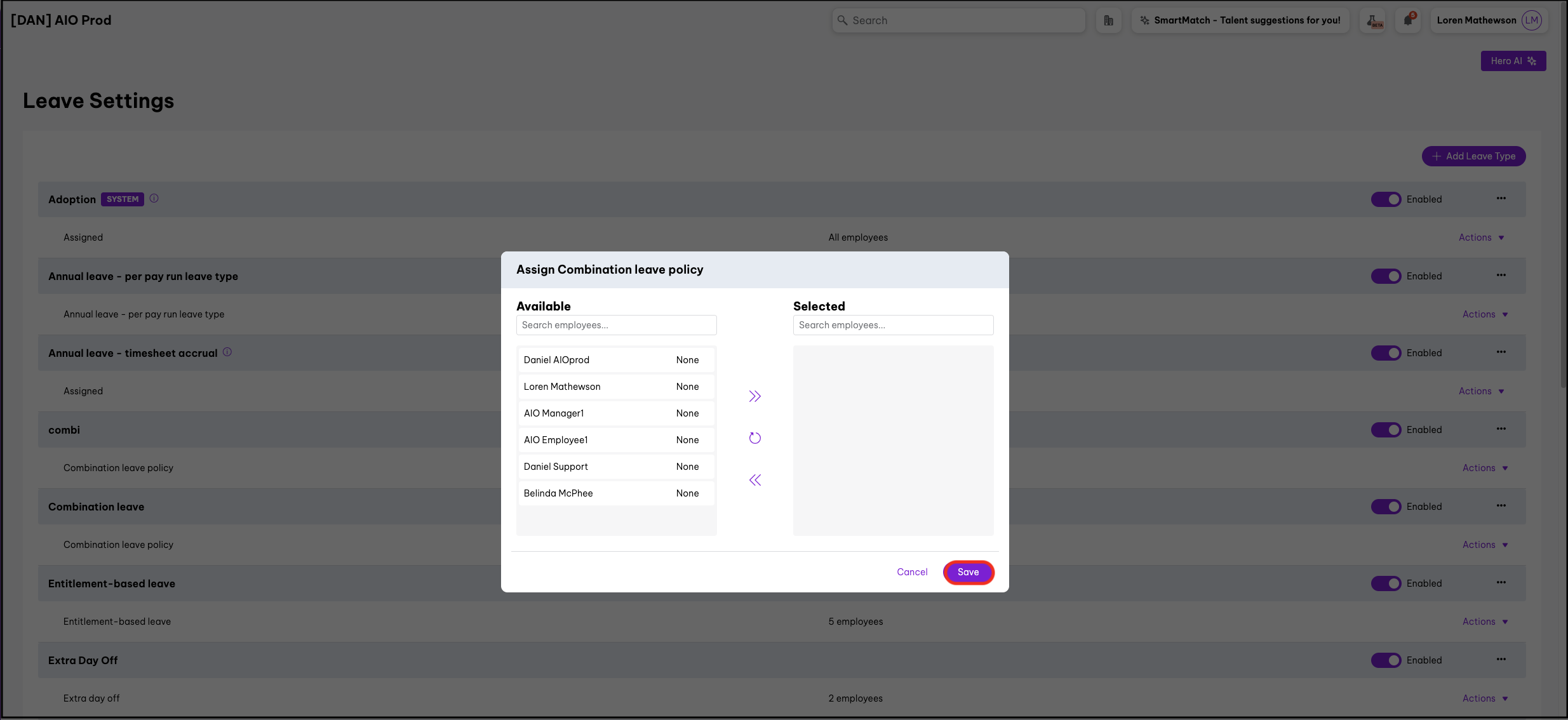 - Assign this leave type to your employees by sliding across the employees you wish to add to the Selected column.