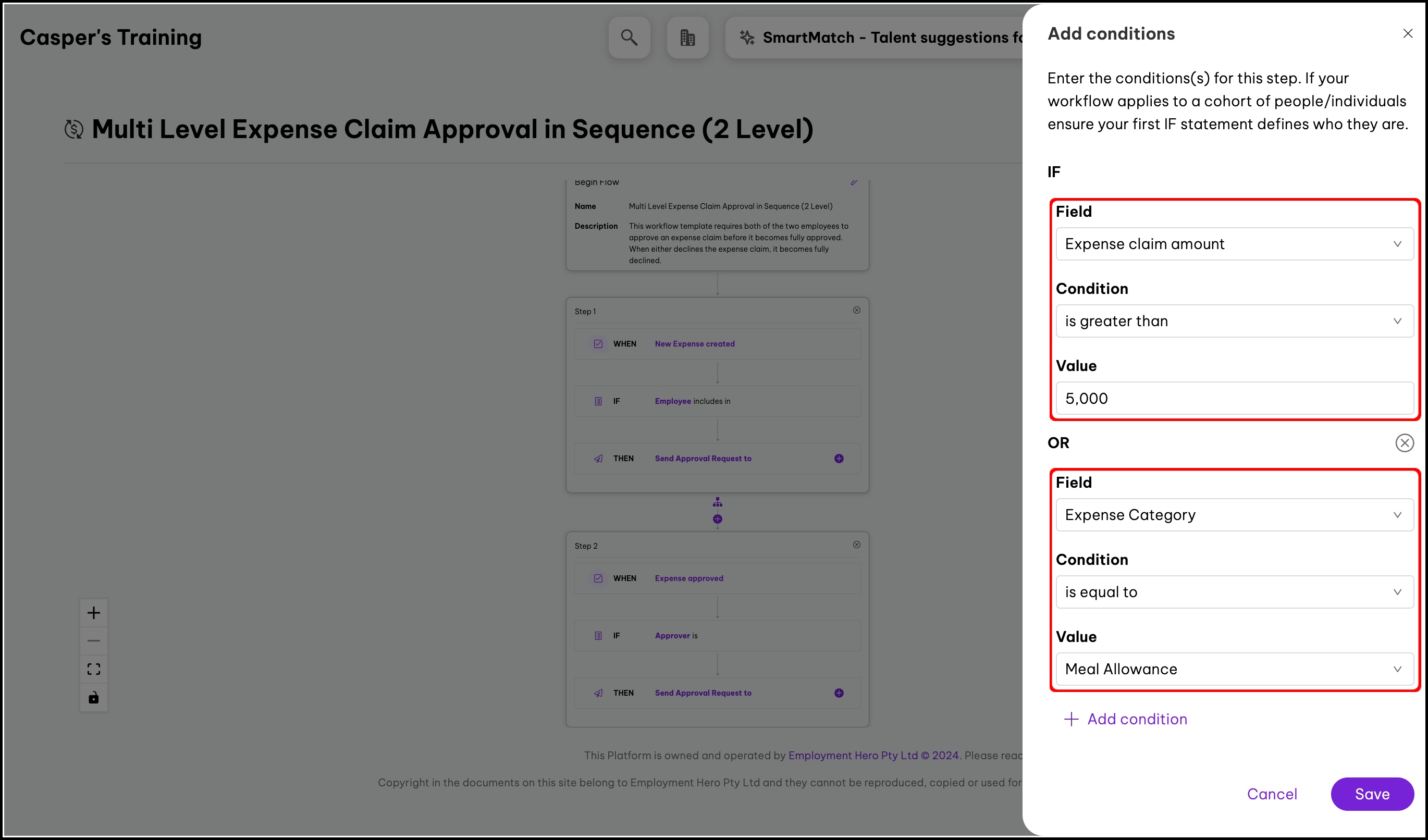 For the image below, the platform will take action if the expense claim amount is over 5,000 OR has a category of Meal Allowance. There just needs to be at least one condition met for the platform to act. So, the workflow will still function if two, three, or more conditions were met.