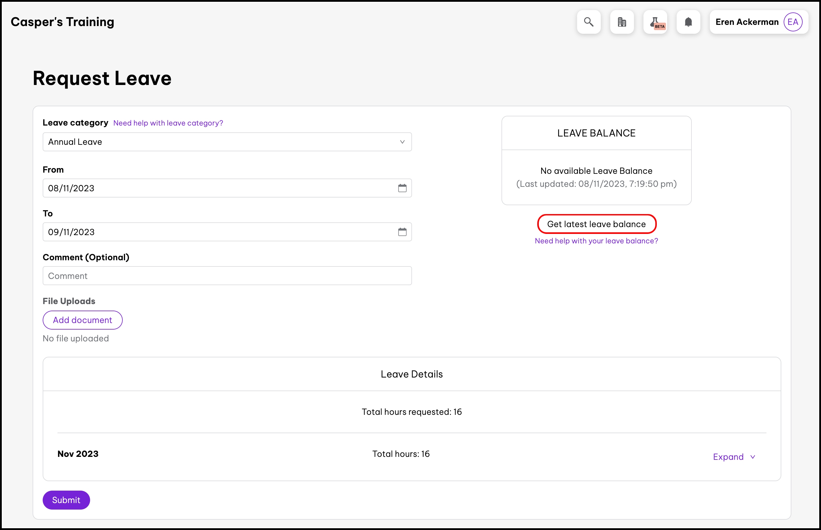 - Click Get latest leave balance to refresh the LEAVE BALANCE details and ensure you have received the most recent information.