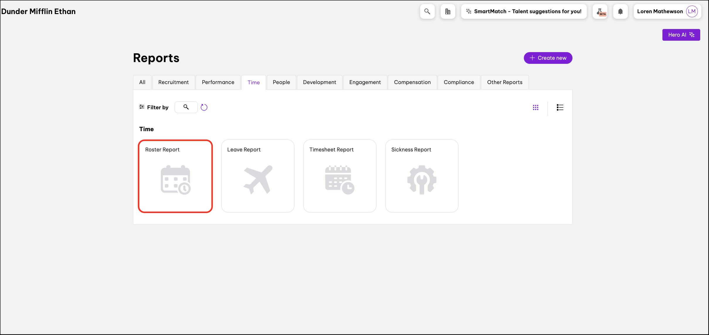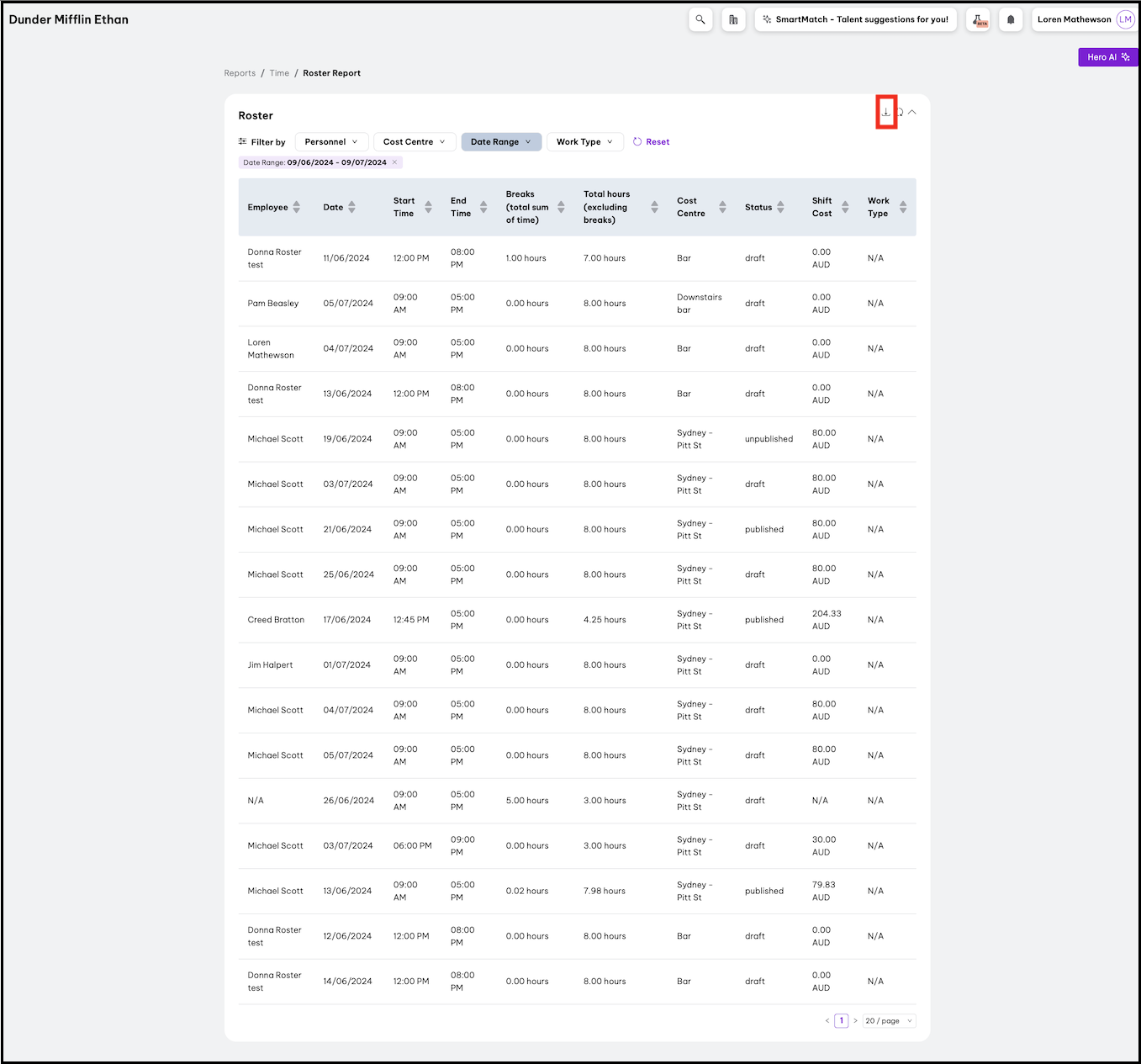 Admins and managers can filter, view and download the rostering report in the reports module on the platform.