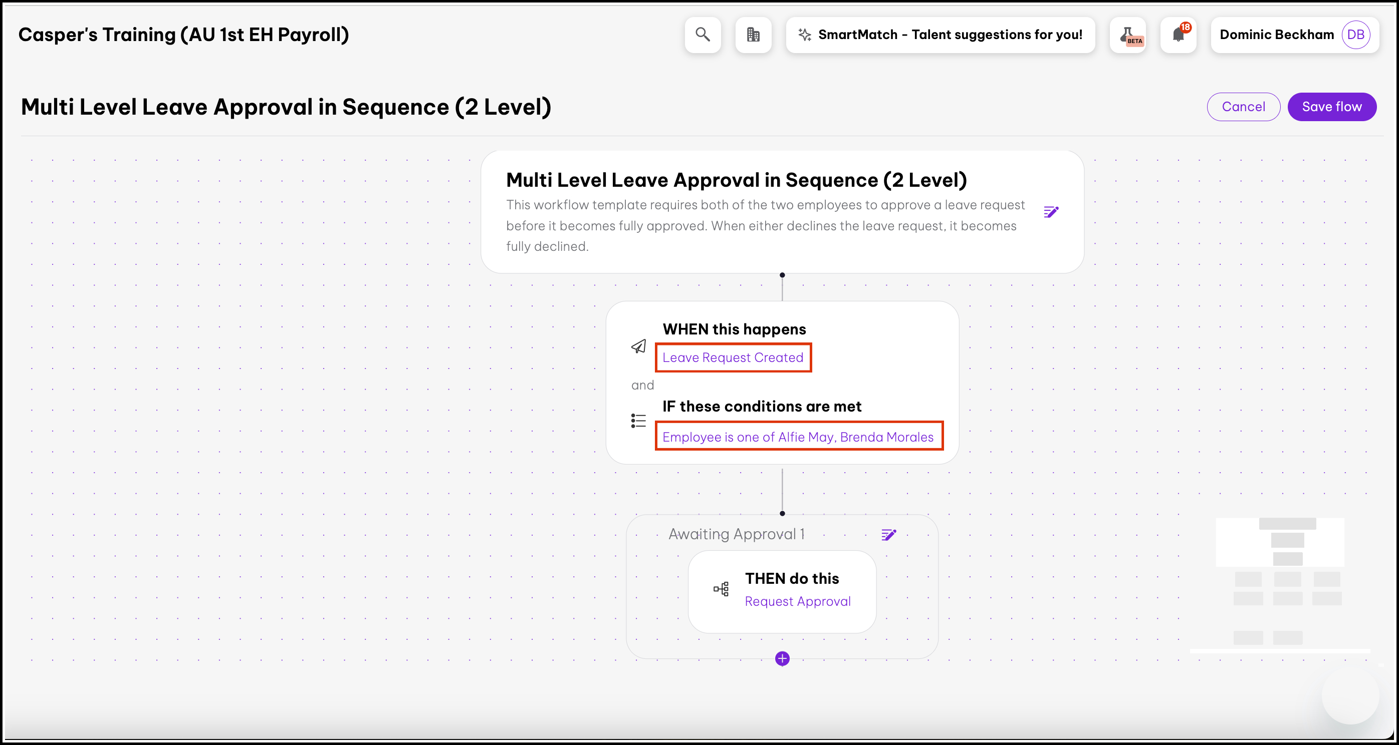 In the example below, the conditions are 'WHEN a leave request is created and IF it's created by Alfie May or Brenda Morales'. You can change these if required.