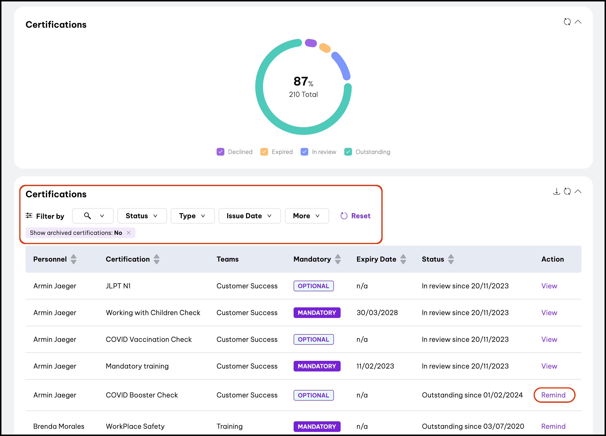 - To ensure the Certifications table displays your required information, select from the following filters: