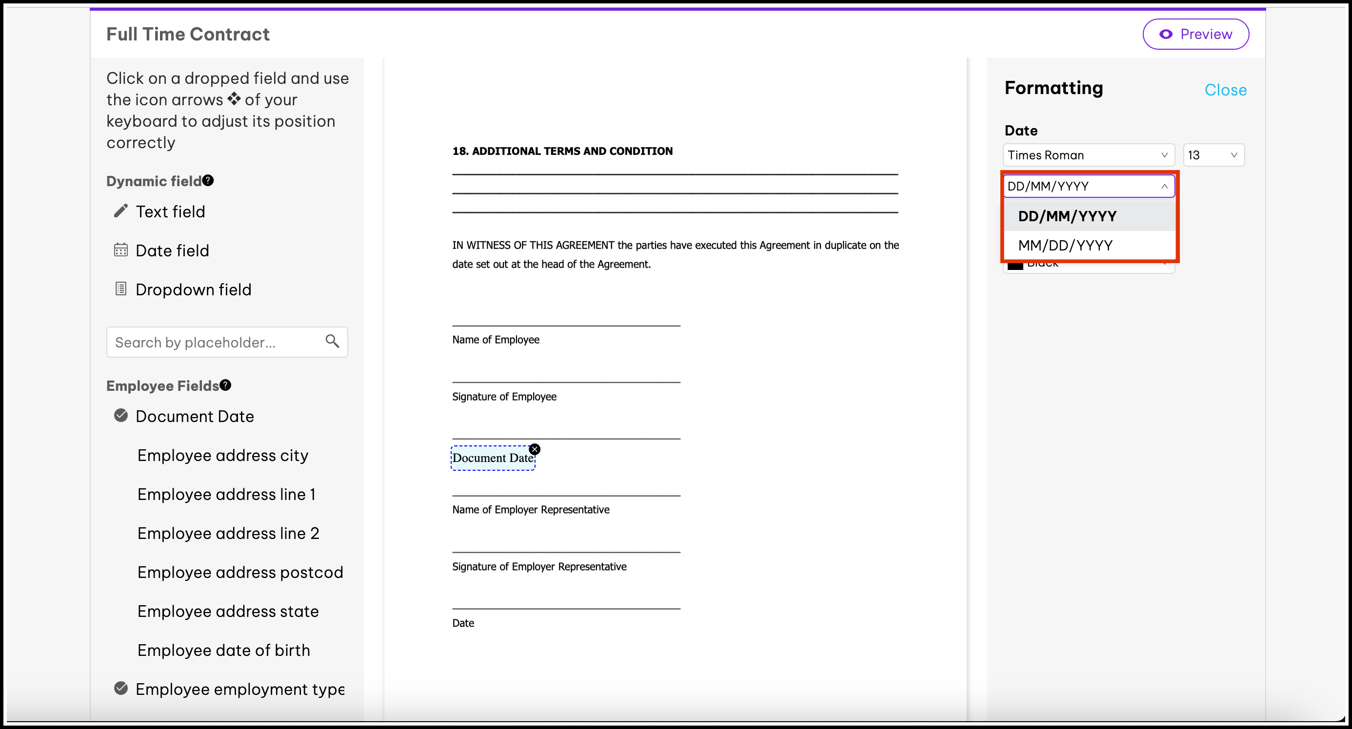 You can change the date format within a document to either DD/MM/YYYY or MM/DD/YYYY using the dynamic fields available in the template editor. To do this, you will need to drag in a date field into the document, then choose the date format. The document will then automatically pull in the correct date in your chosen format.