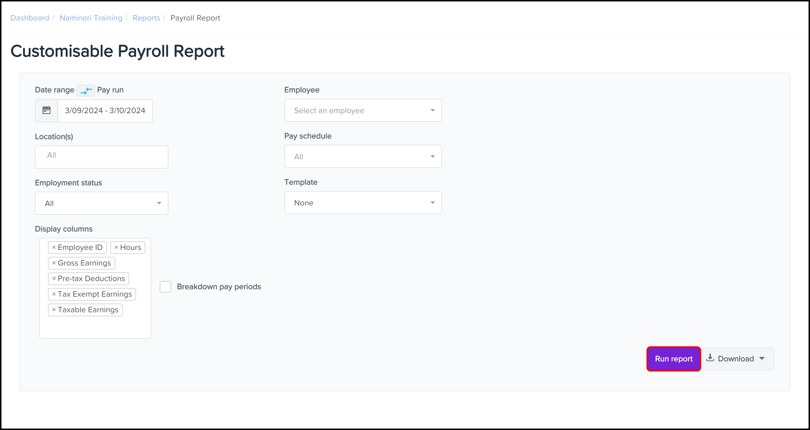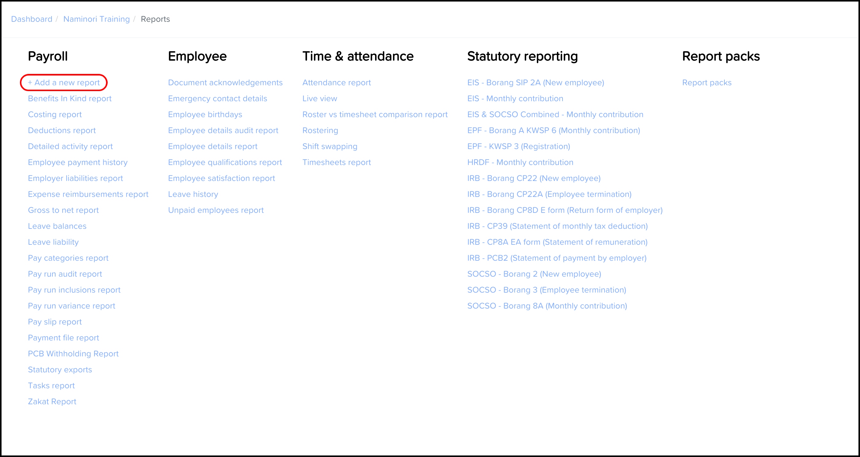 - Under Payroll, click +Add a new report.