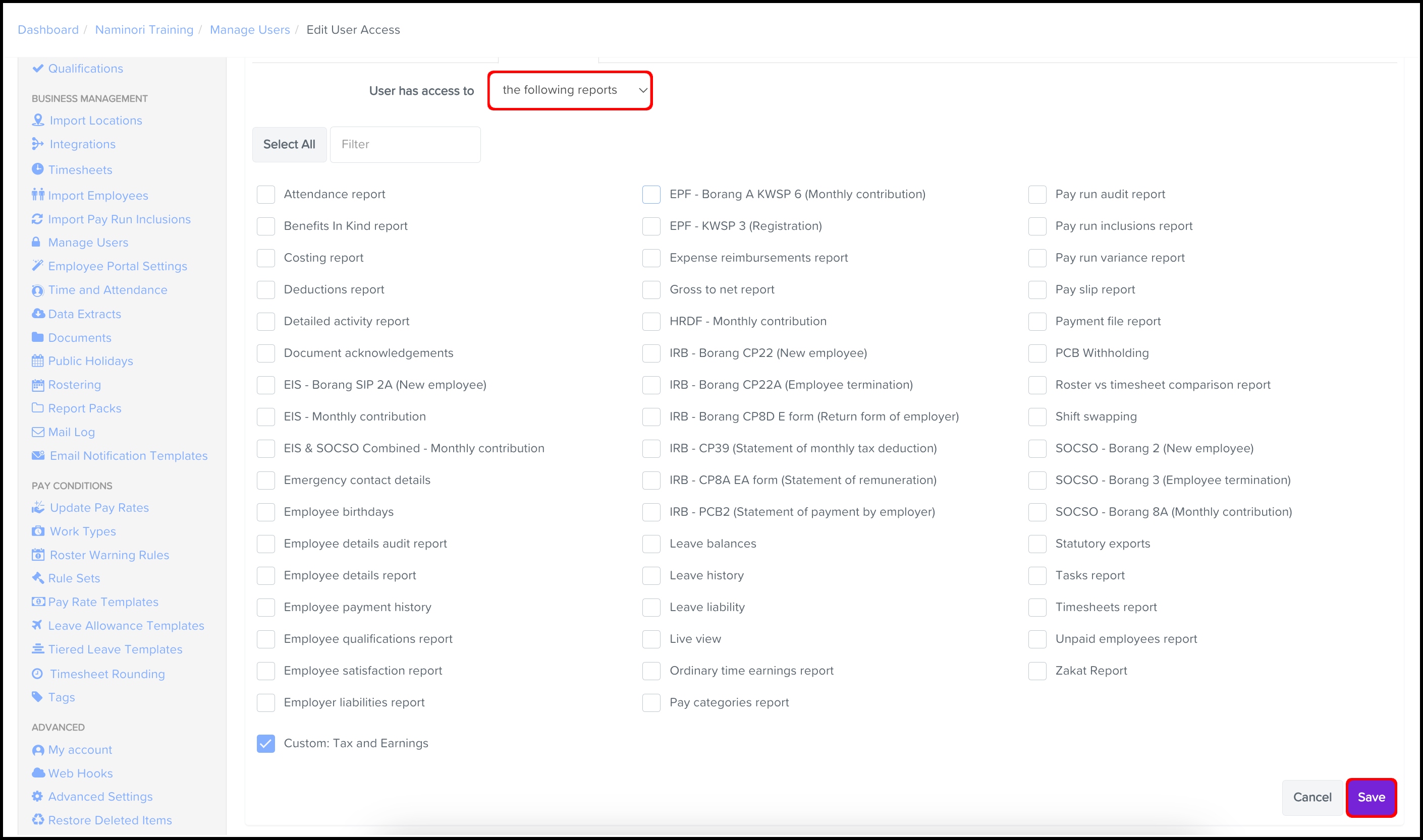 - Click the reports you want to give access to.