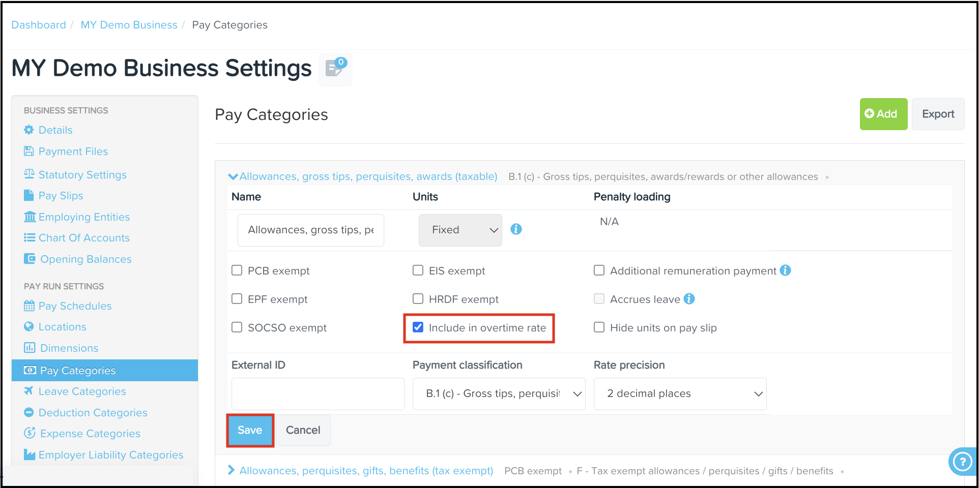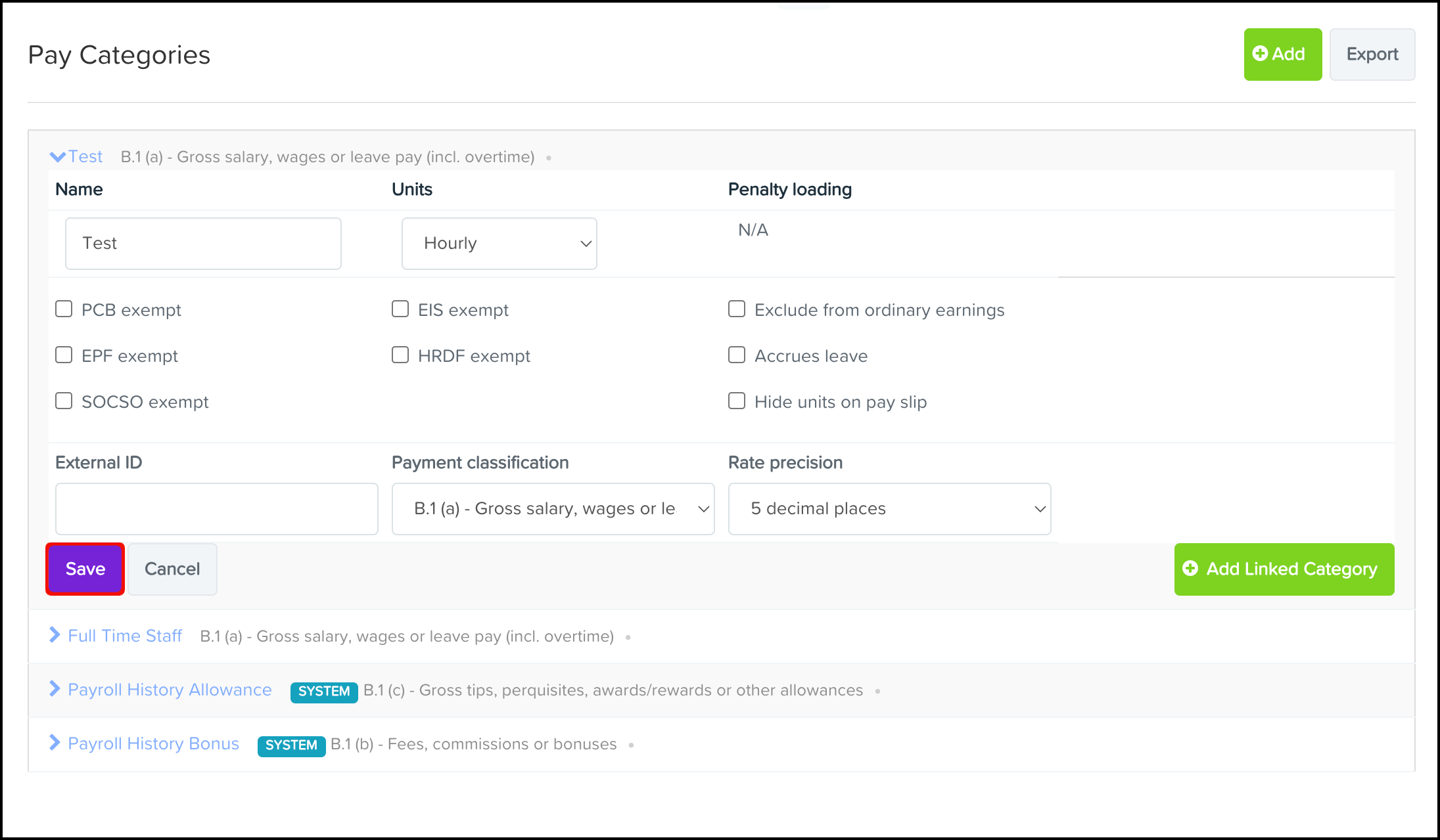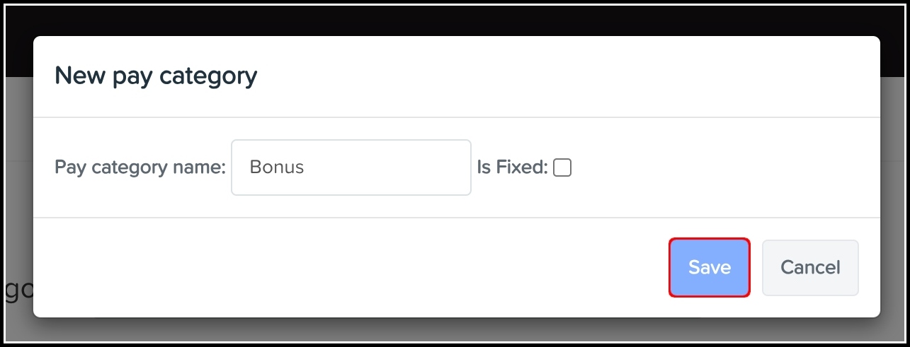 - Once you have completed the details of the pay category, click the Save button on the bottom left of the pay category box.
