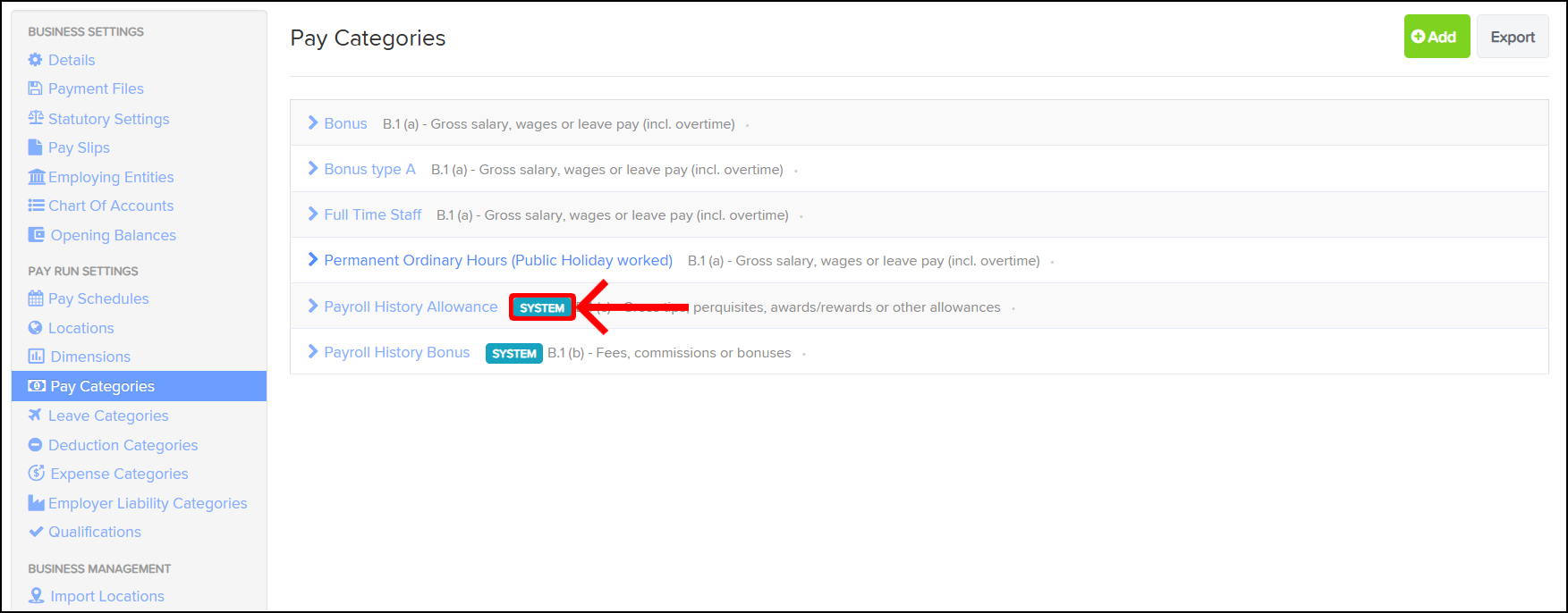 When you create a new business, there are several pay categories that are pre-loaded into the platform for your convenience. Among these, there are 'System default' categories that are marked with a 'System' tag, as shown below.