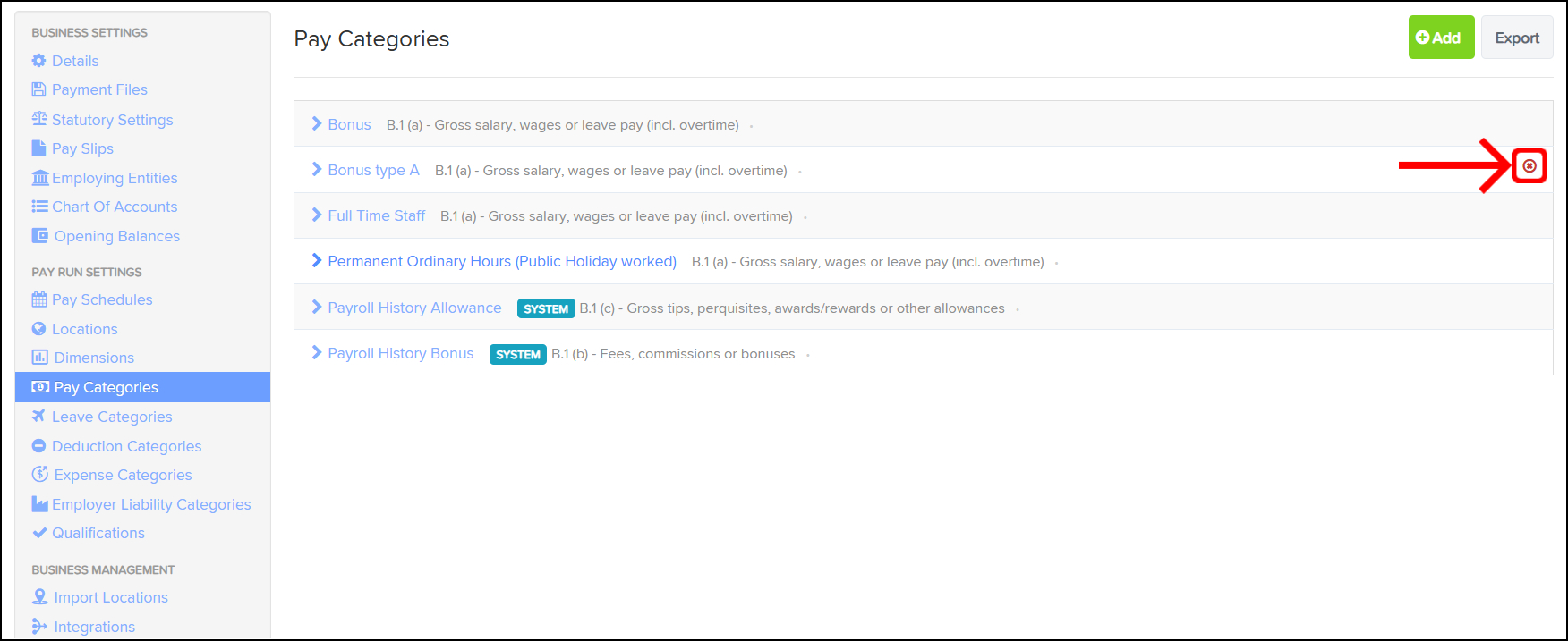 To delete a pay category, hover your mouse over the pay category name where you will then see a red cross icon on the right hand side of the pay category.