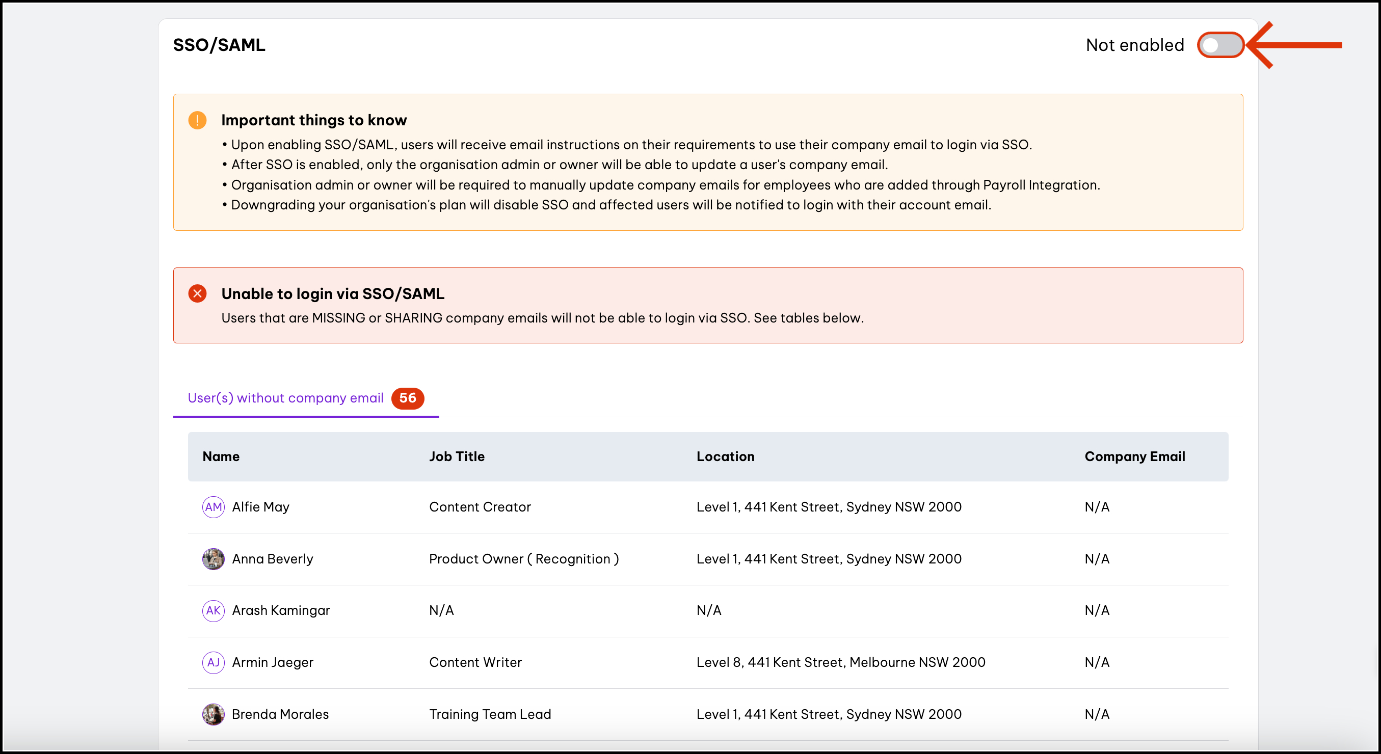 - Have a different company email address in their other organisation so they can login via SSO using a different email address