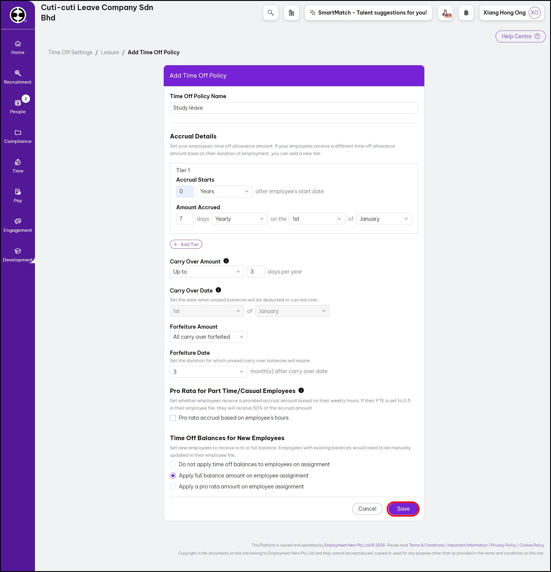 - With Forfeiture Amount, you can specify if any unused leave will be forfeited if not taken by the employee within a certain period.