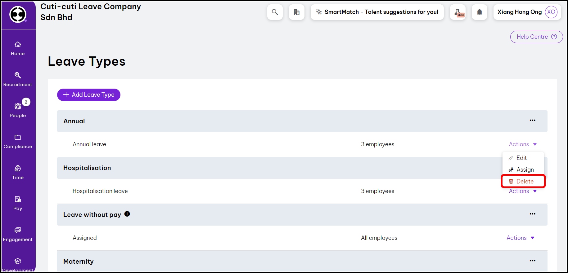 Deleting a leave type