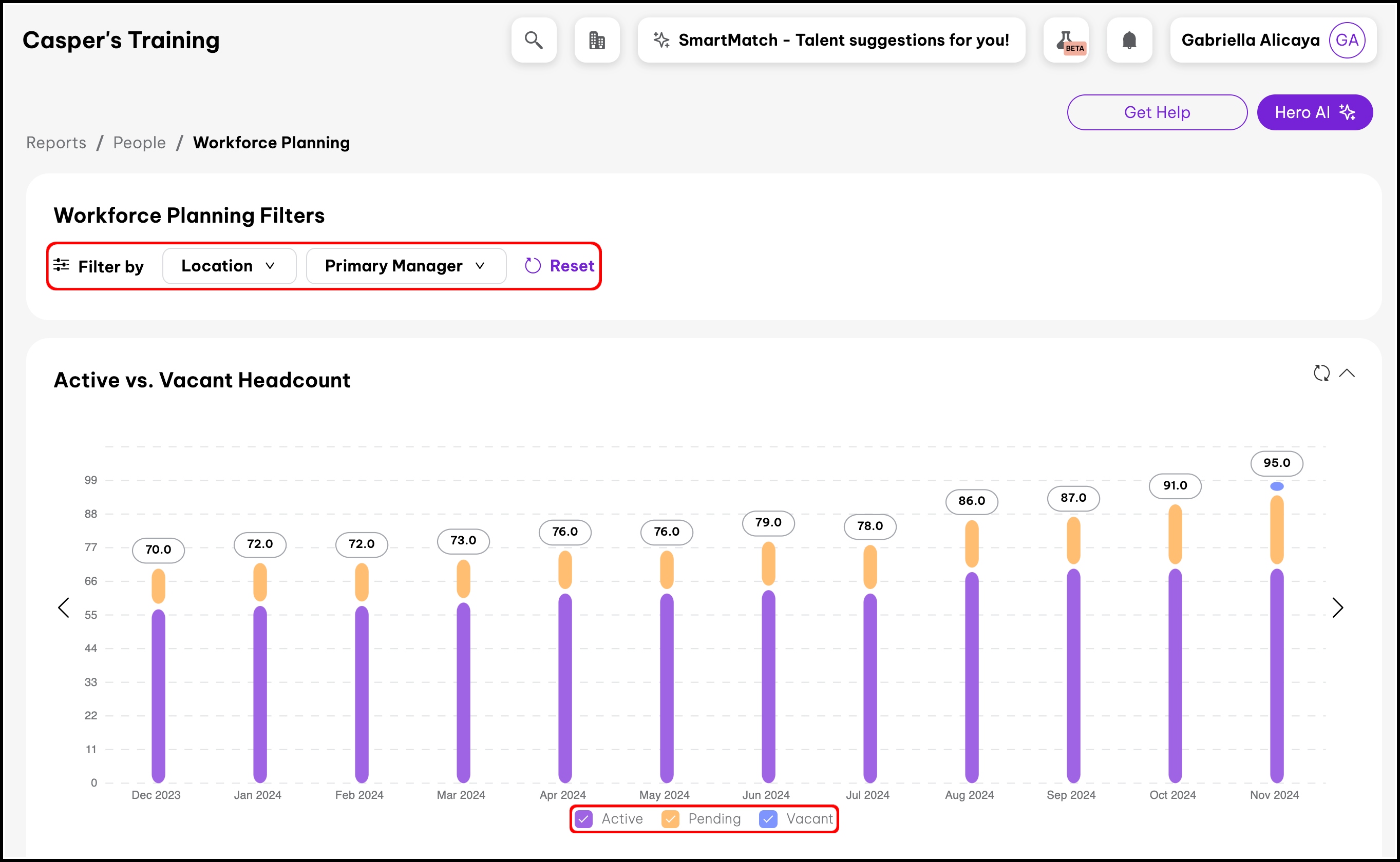 You can use the Workforce Planning report to view, track, and report on the number of vacant positions you have within your business over time. The report will give you insight into your existing, budgeted, and requested headcount and headcount costs. This way, you have the important information you need for business reporting and planning cycles.