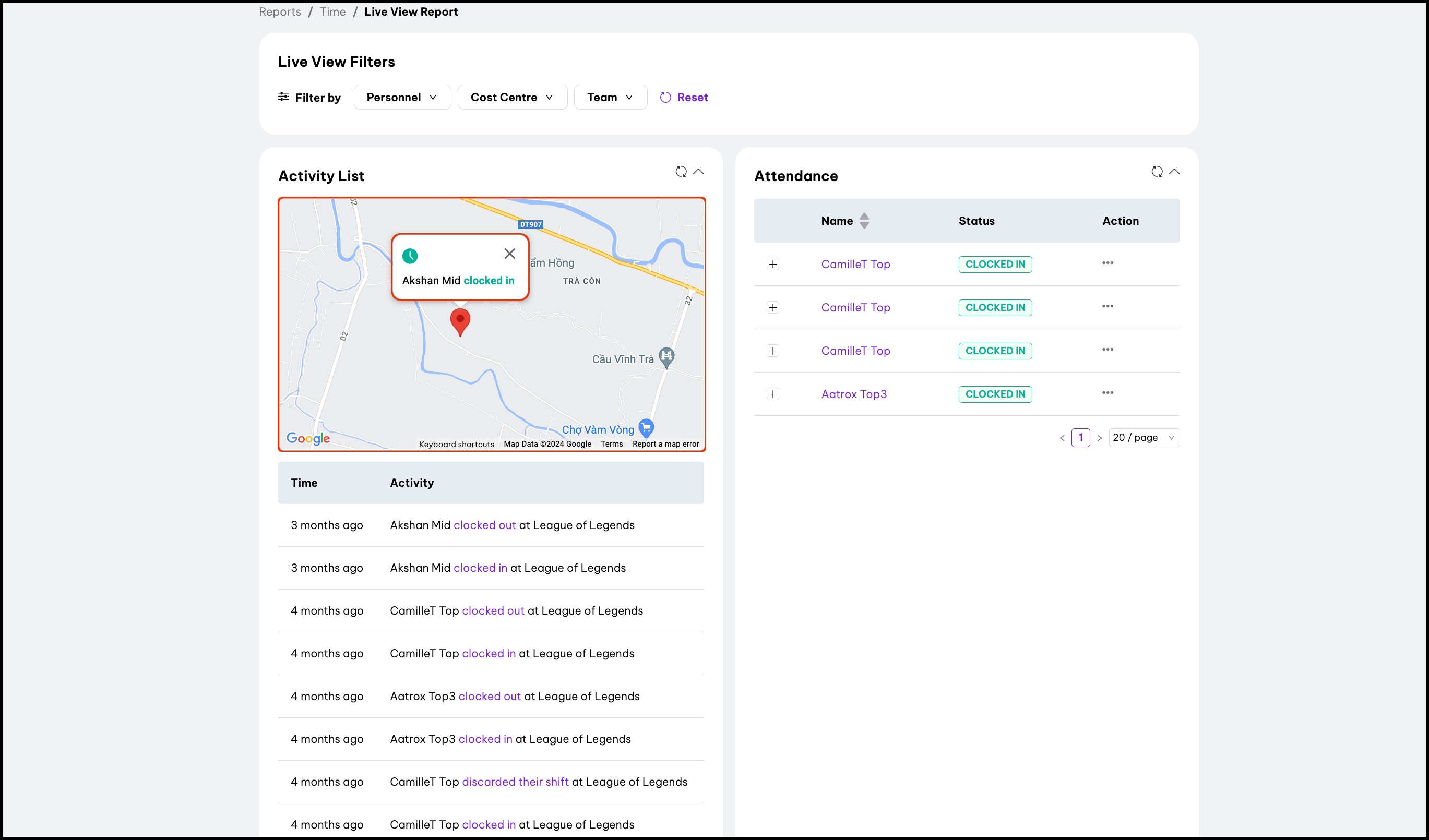The Live View Report feature provides an Activity List and Attendance page, displaying a Google Maps view of employees' clock-in/out locations and their current status (e.g. 'Clocked In'). Admins can also use Live View Filters to make the report show specific personnel, cost centre, and team data.