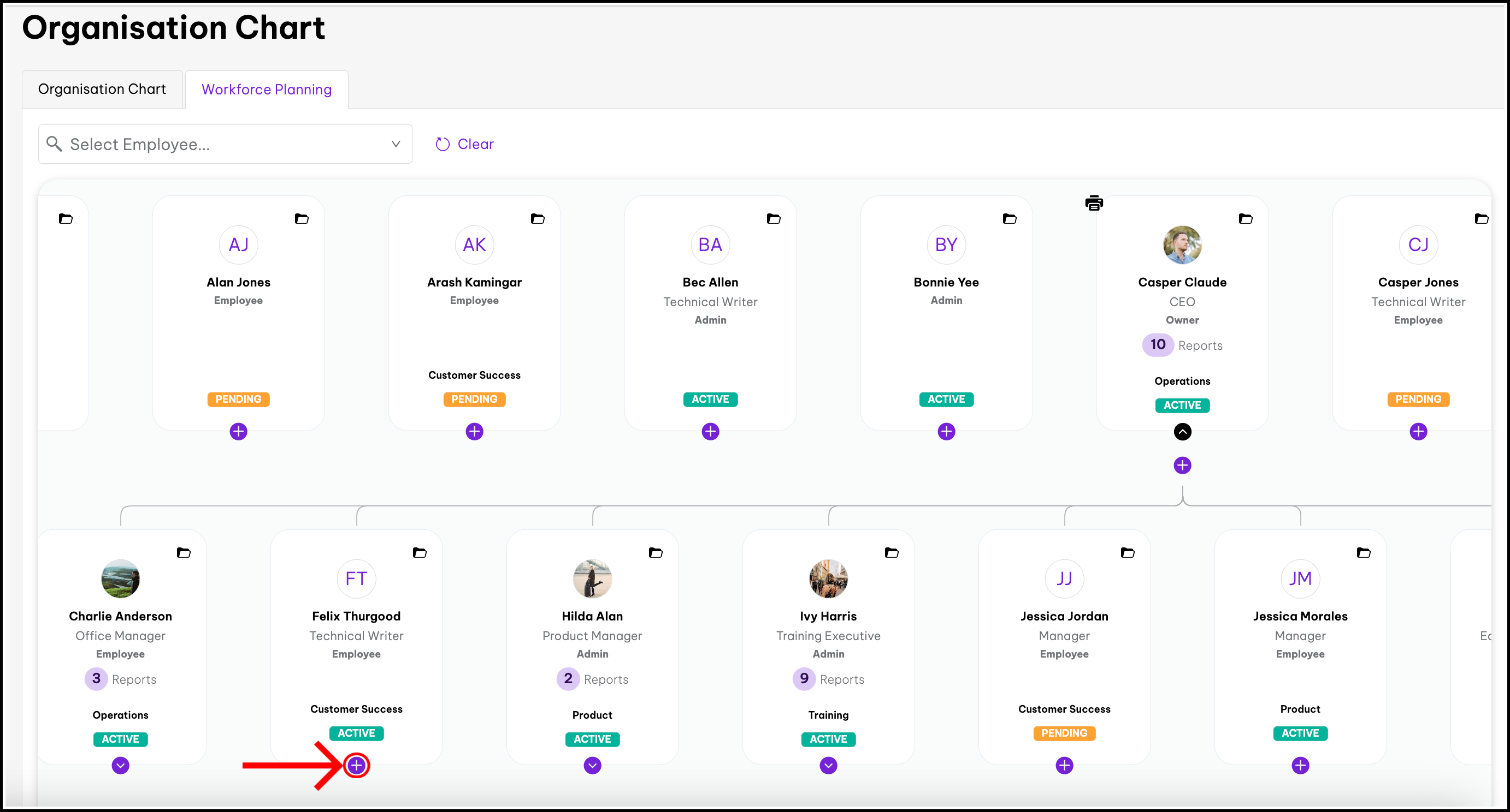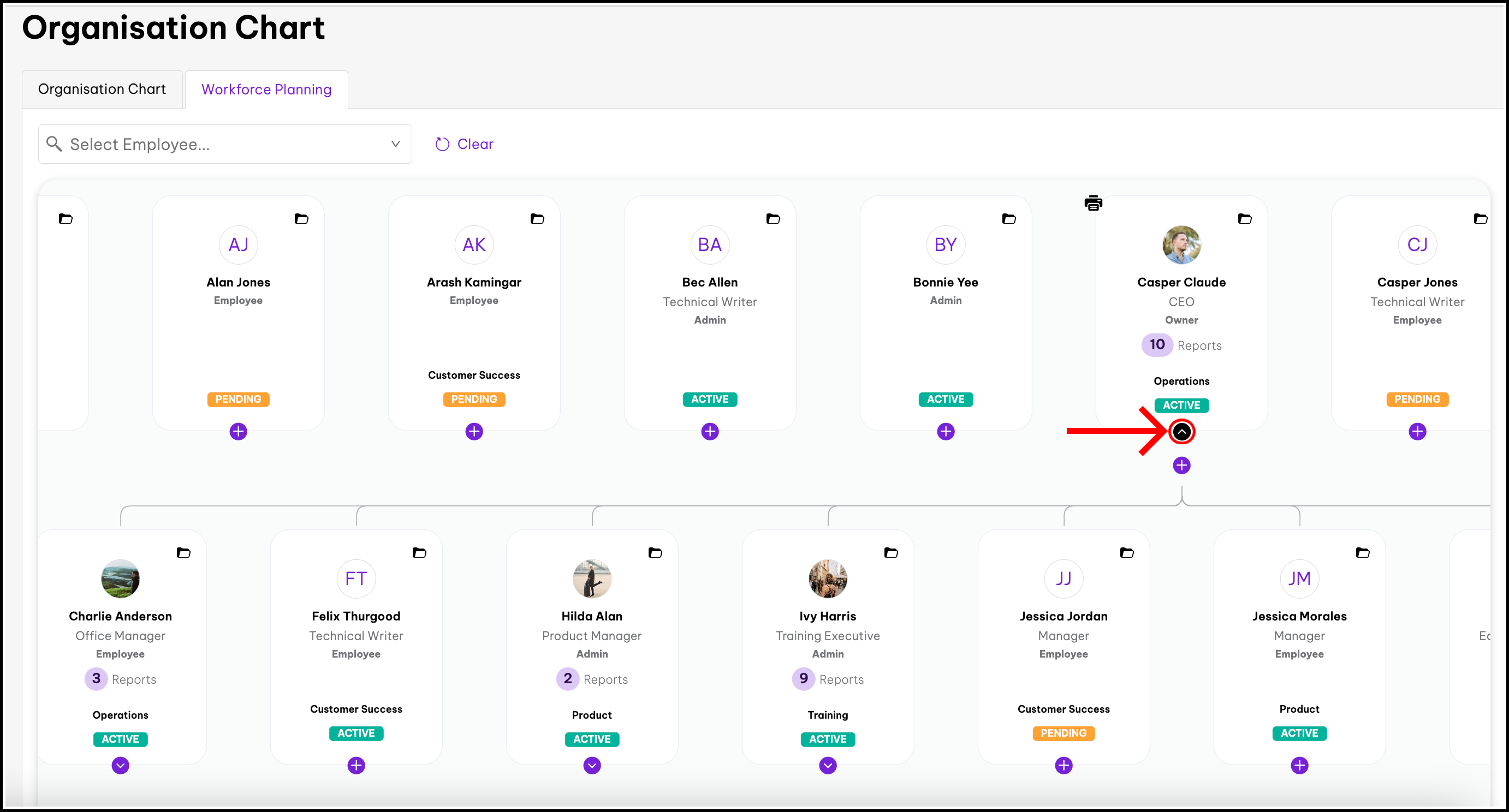 - Navigate to an employee. You can scroll up and down along the organisation chart. You can also open up an employee's reports using the arrows next to their profile.