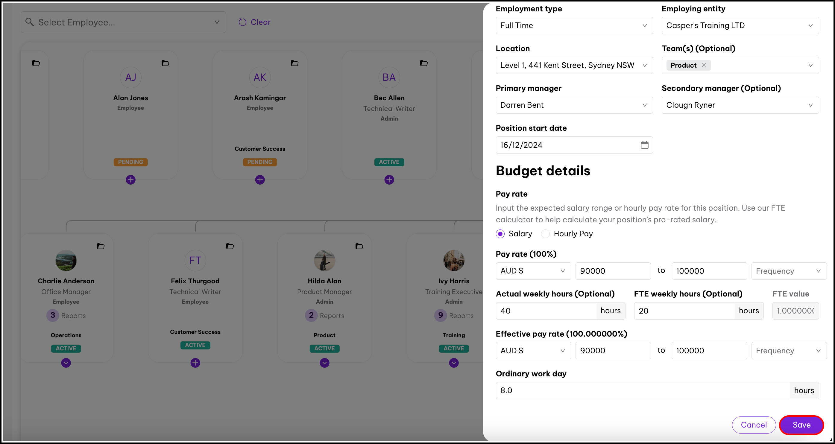 - You can populate the position details in the side panel that opens up by selecting an employee or position as a template.