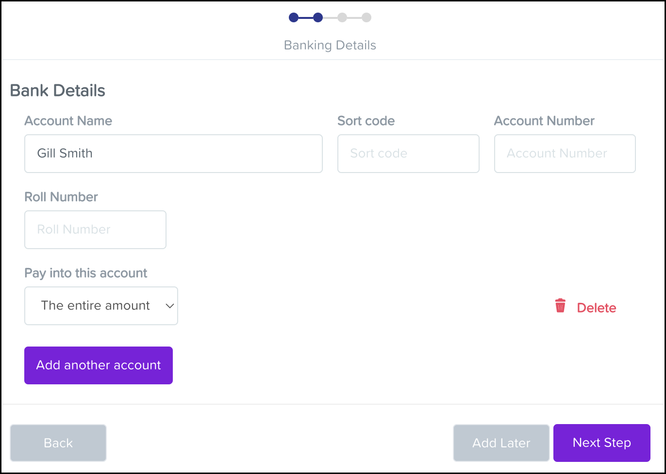 - The next page of the setup process is Banking Details. You can add multiple bank accounts and select how much pay goes into each account.
