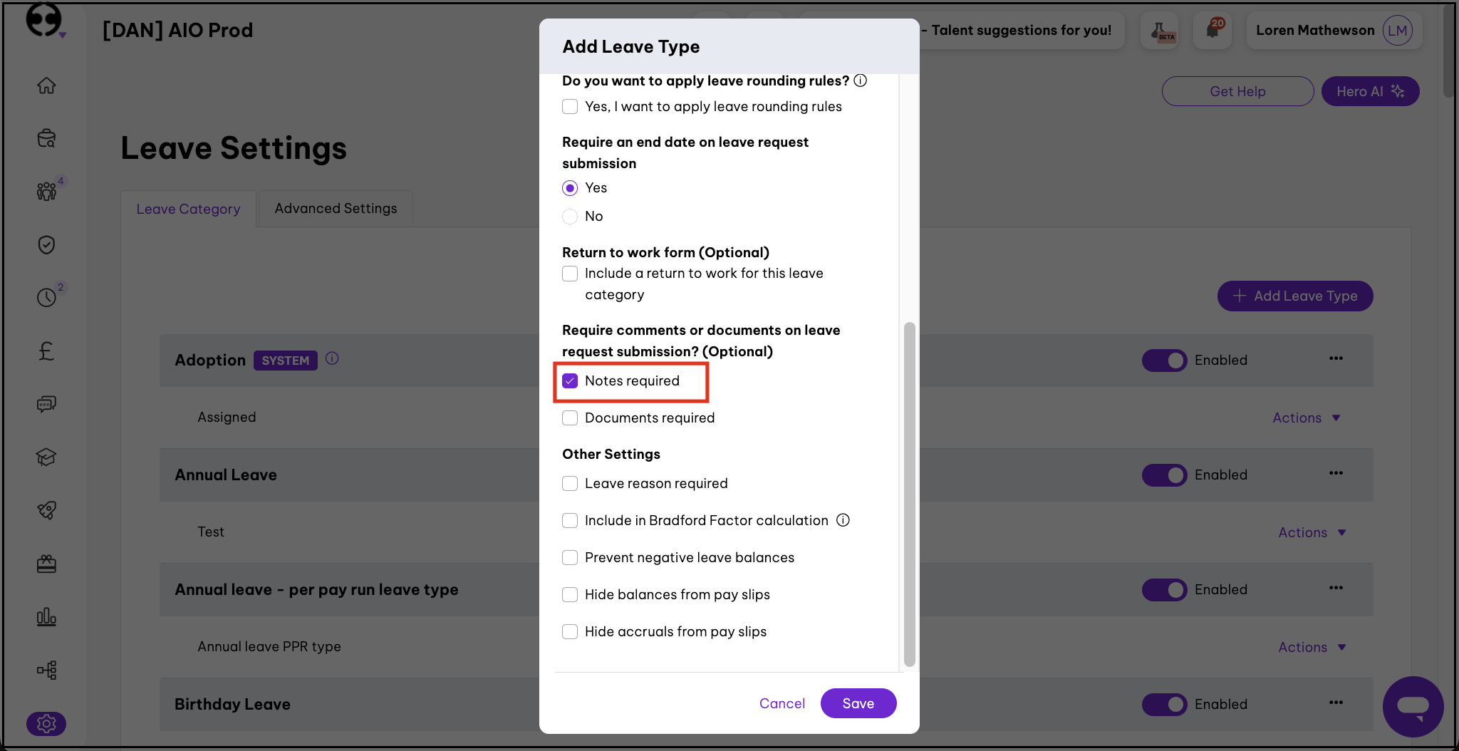 - Tick Require notes or documents on leave request submission?