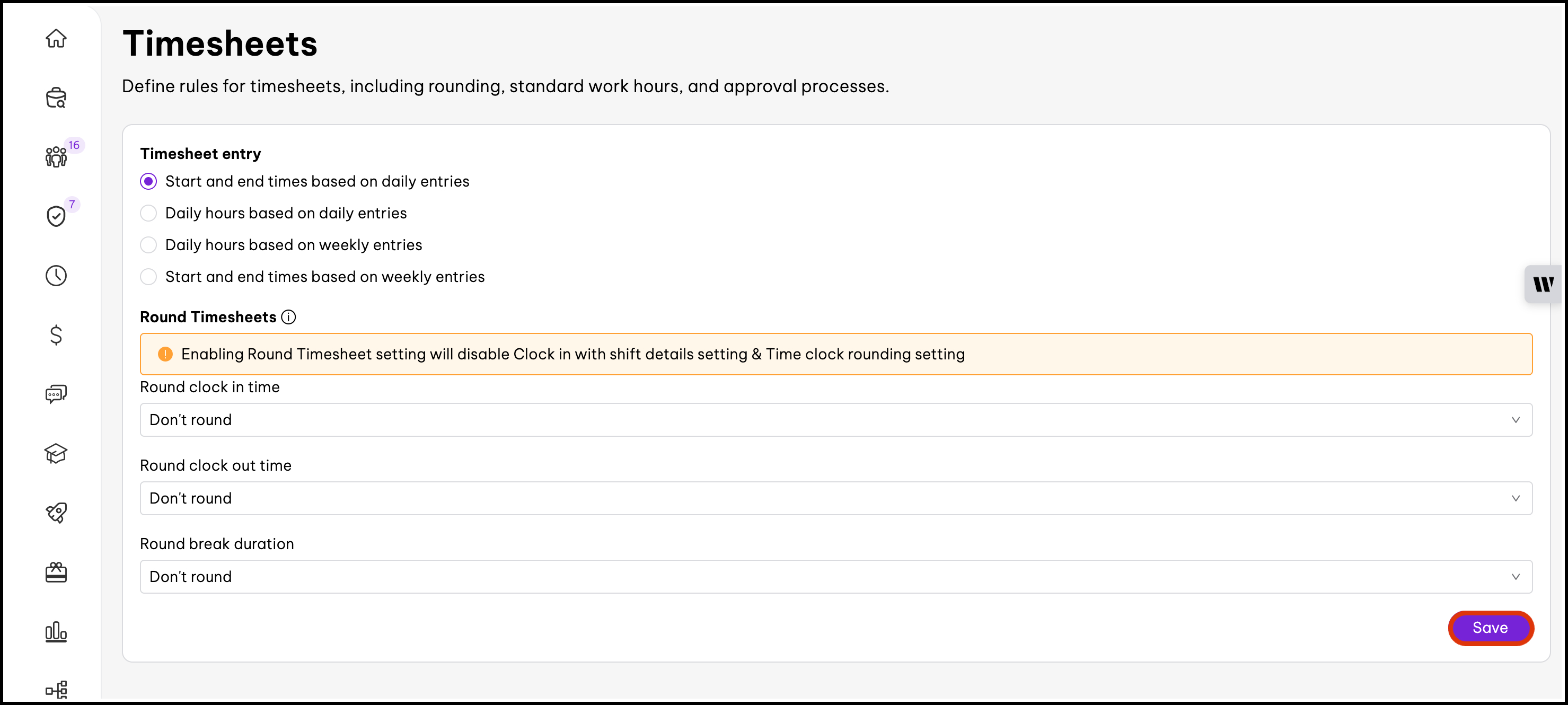 You can change timesheet settings to suit your organisation's setup. The Timesheet rounding makes payroll easier by allowing you to round up or round down an employee's clock in or out time, to the nearest 5, 10, 15 or 30 minutes.