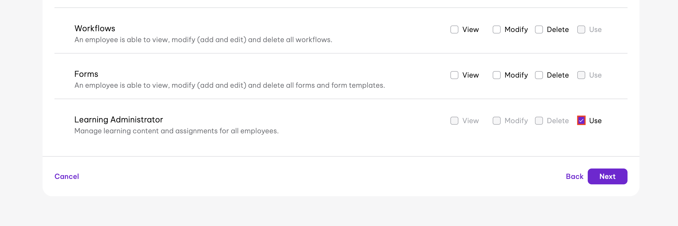 - Tick the Use checkbox for Learning Administrator.