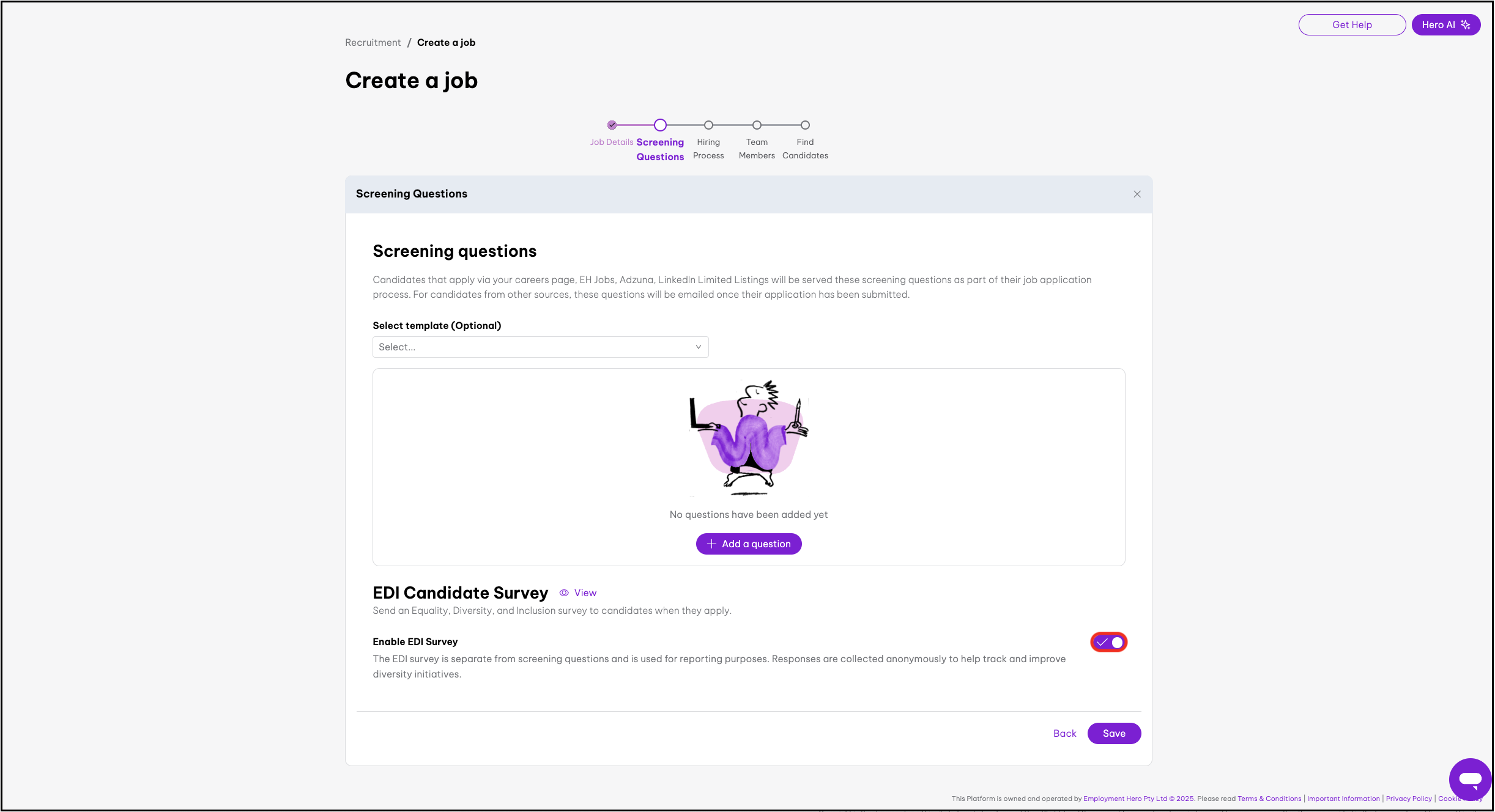 - Under EDI candidate survey, toggle on if you want to enable the candidate survey (the toggle will appear purple when toggled on).