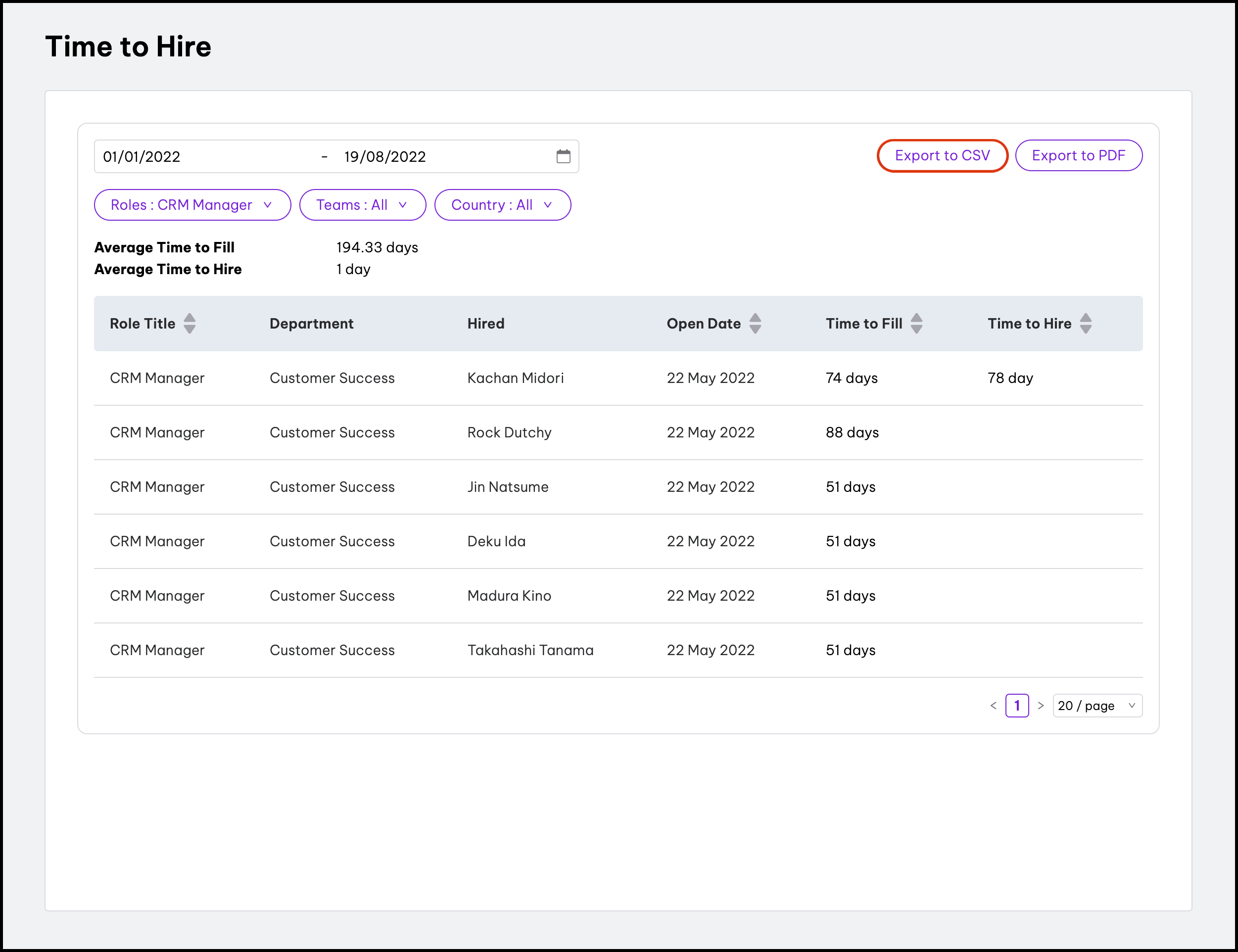 The Time to Hire Reporting feature allows you to create a report on how long it takes your organisation to fill a position and you can see details such as the open date, time to fill and time to hire. You can also use this feature to download a CSV file of the data, enabling you to load the report into a CSV-supported program like Microsoft Excel.