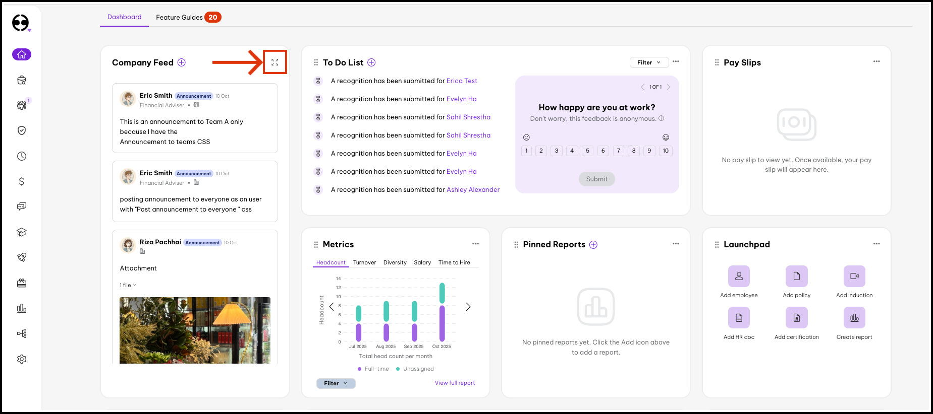 The Company Feed feature allows you to create and share posts with your organisation. You can post announcements, recognise colleagues, celebrate birthdays and work anniversaries, give shoutouts, and share general updates. Posts support rich content including images, videos, files, emojis, and hyperlinks. This fosters a culture of open communication, boosts morale, and ensures employees feel appreciated for their contributions.