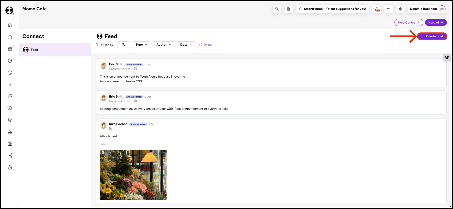 - Type - Filter by post type (Regular, Shoutout, Recognition, Announcement, Birthday, Anniversary)