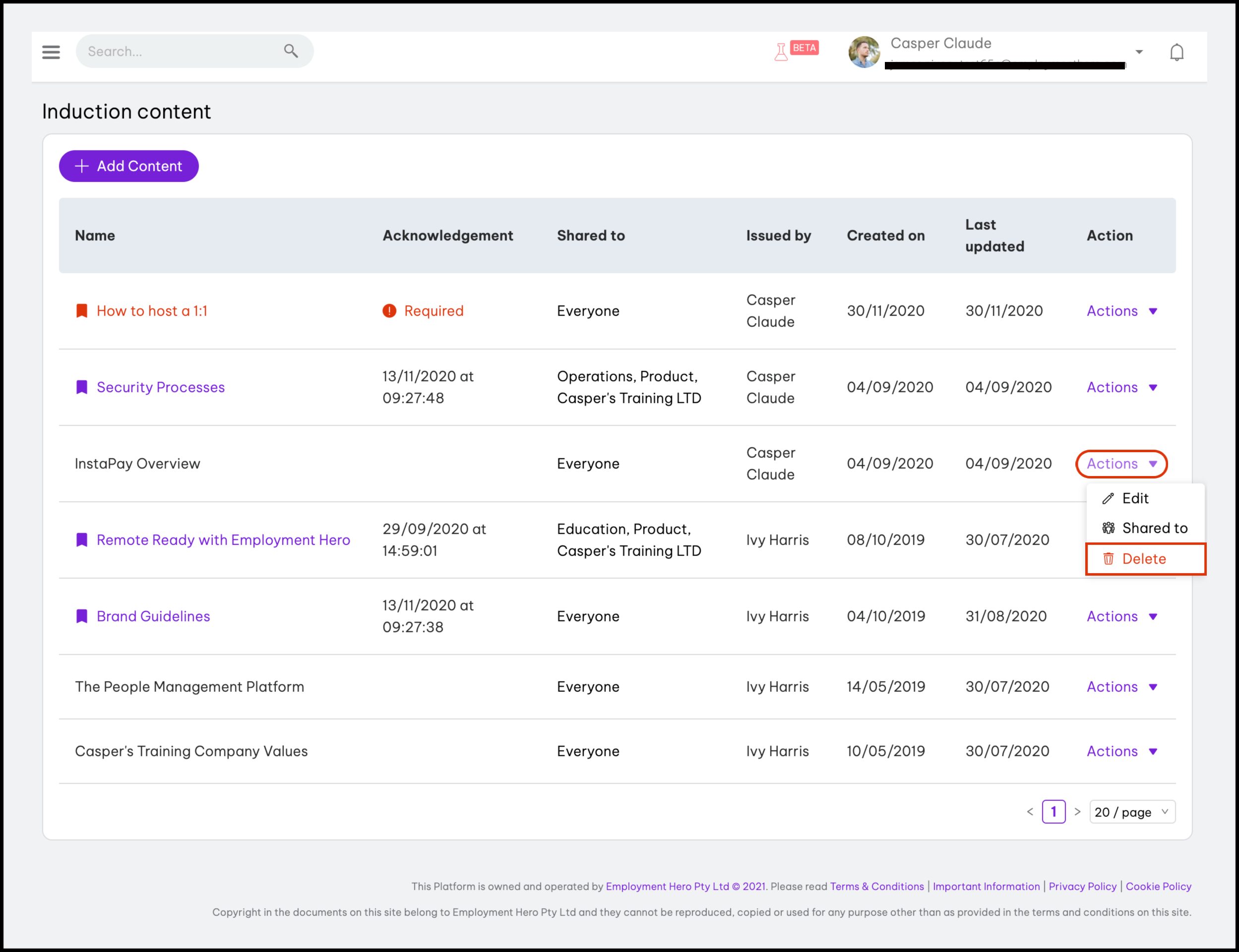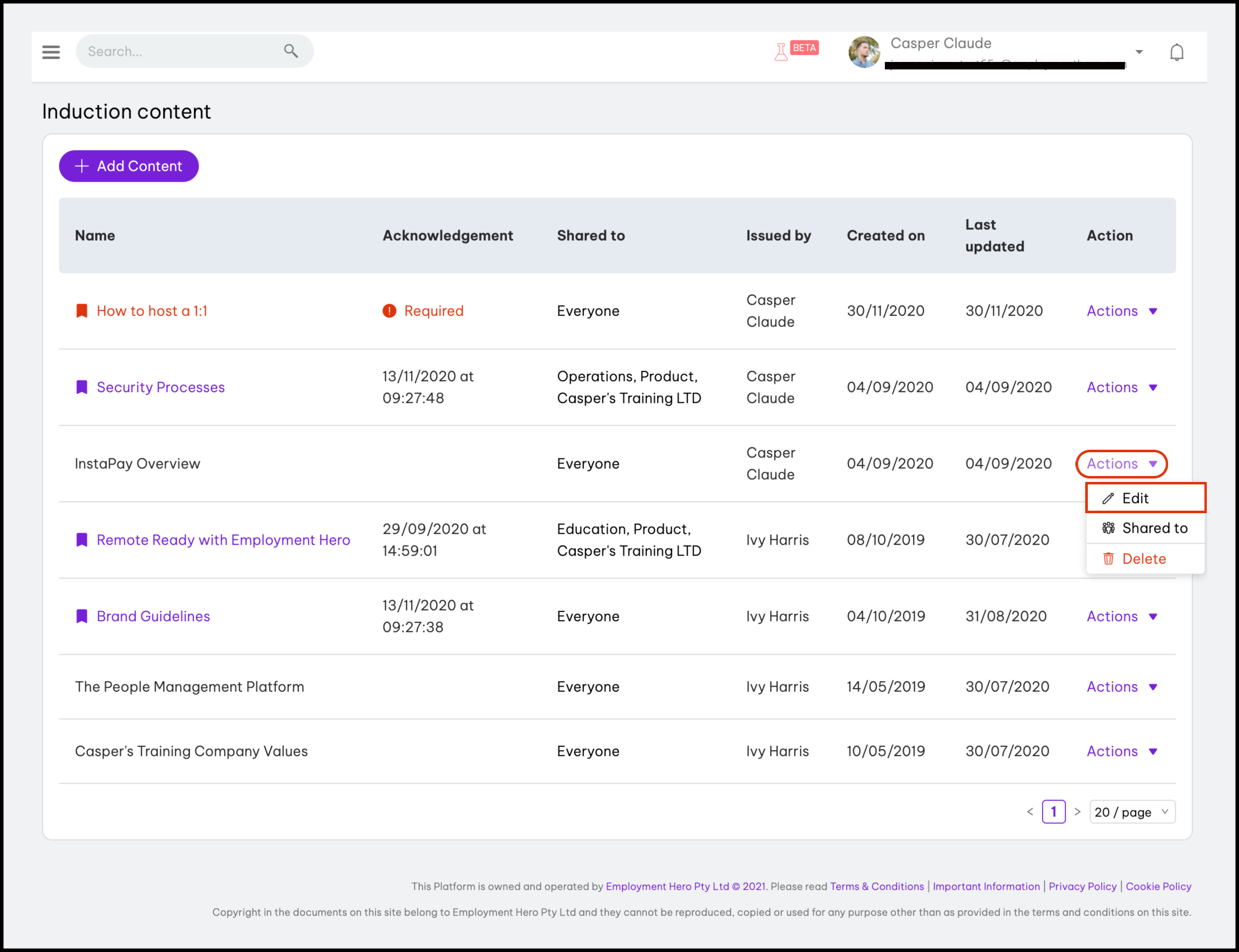If you edit or alter your Induction Content, we will ask any employees linked to this document, and assigned to this content to acknowledge it again.