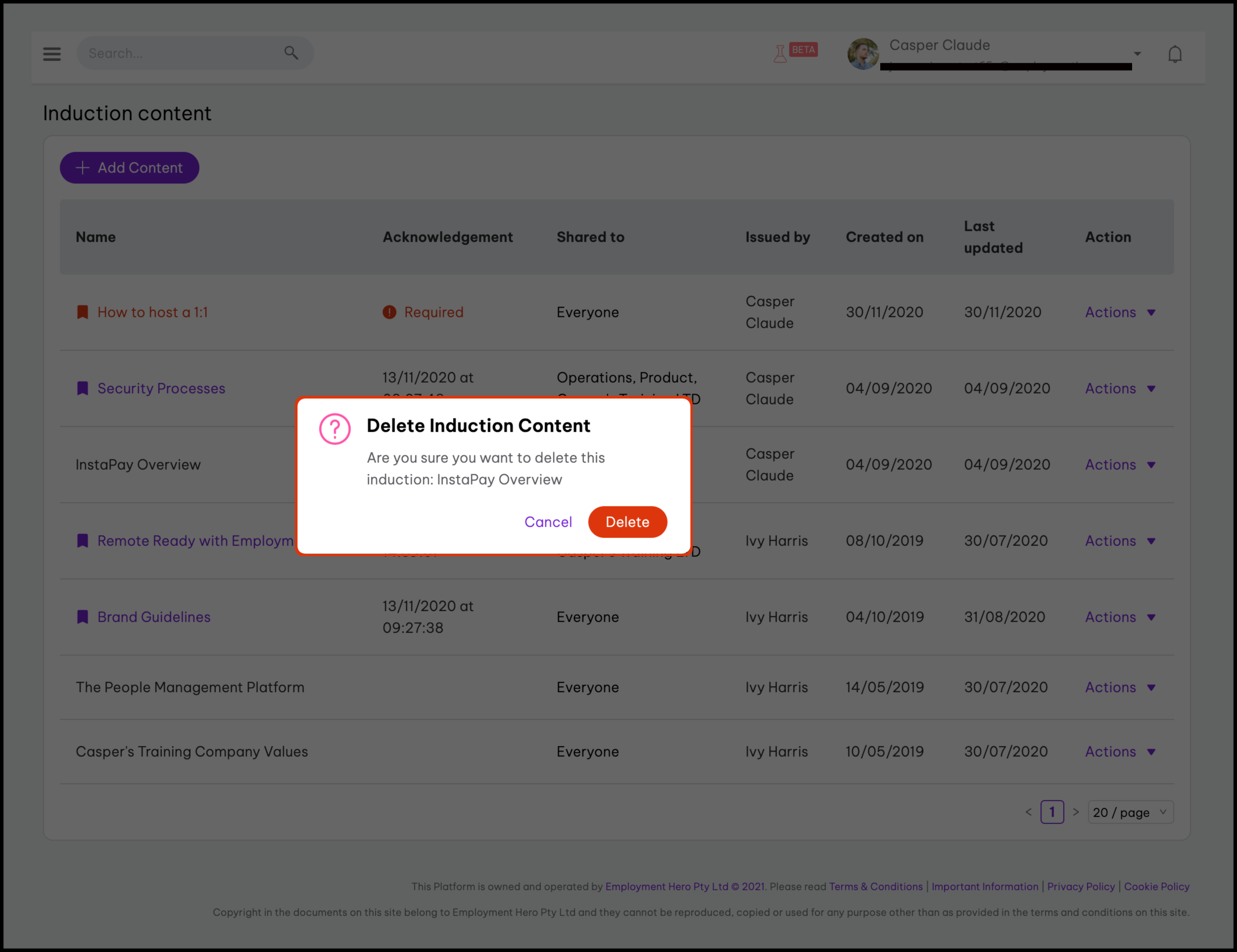 If you replace induction content with a newer version, then you will permanently lose any supporting documents and employee acknowledgements attached to the previous version. Also, you can only report on induction content marked as required via the Induction Content report. It is because we do not ask employees to acknowledge non-mandatory induction content.