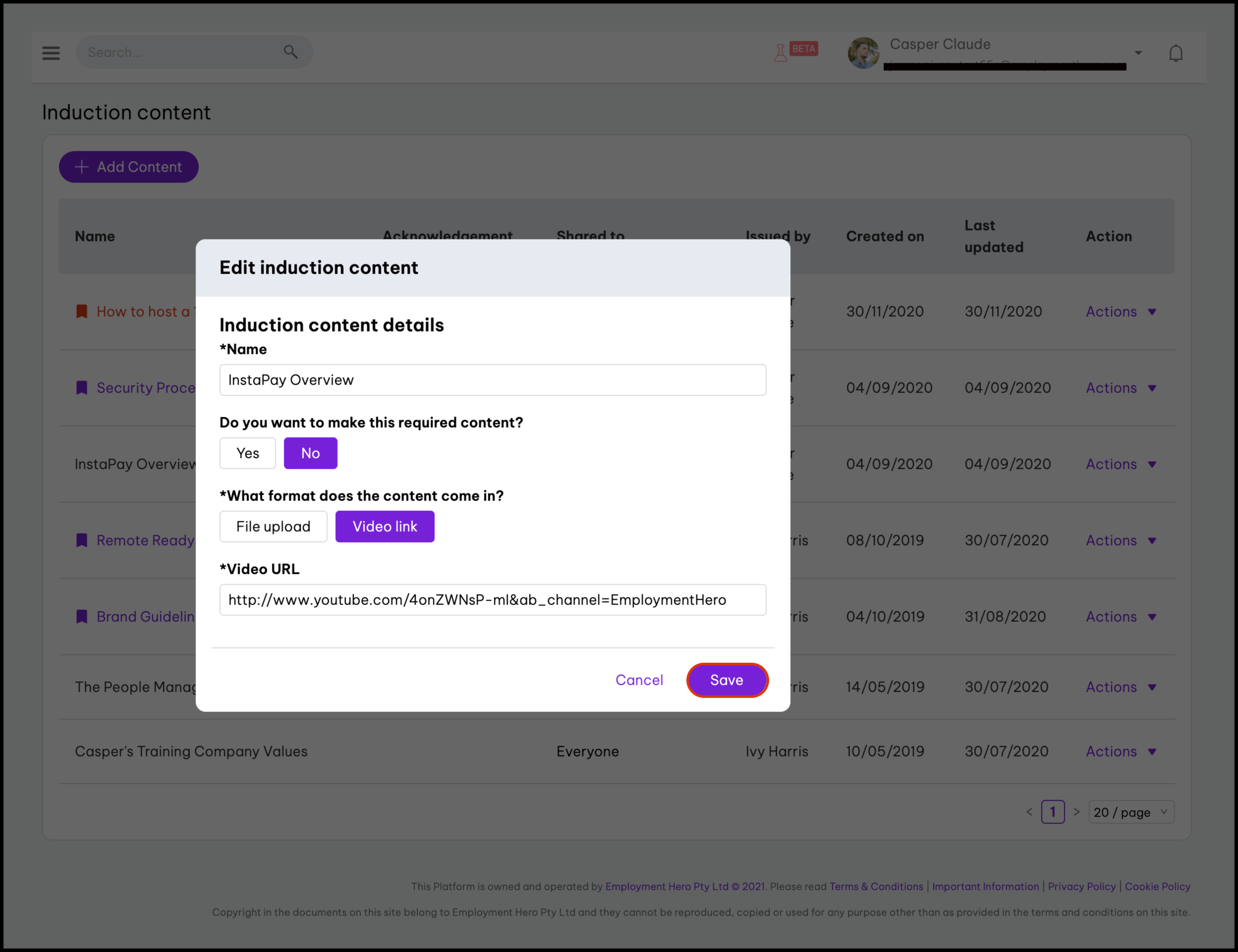 The Induction feature allows you to upload induction material as either a YouTube video, PDF, Doc, and/or Docx file and determine what employee will receive this content. The feature also allows you to edit the information if it changes, re-assign the material to another user group, and delete the data if it is no longer required.