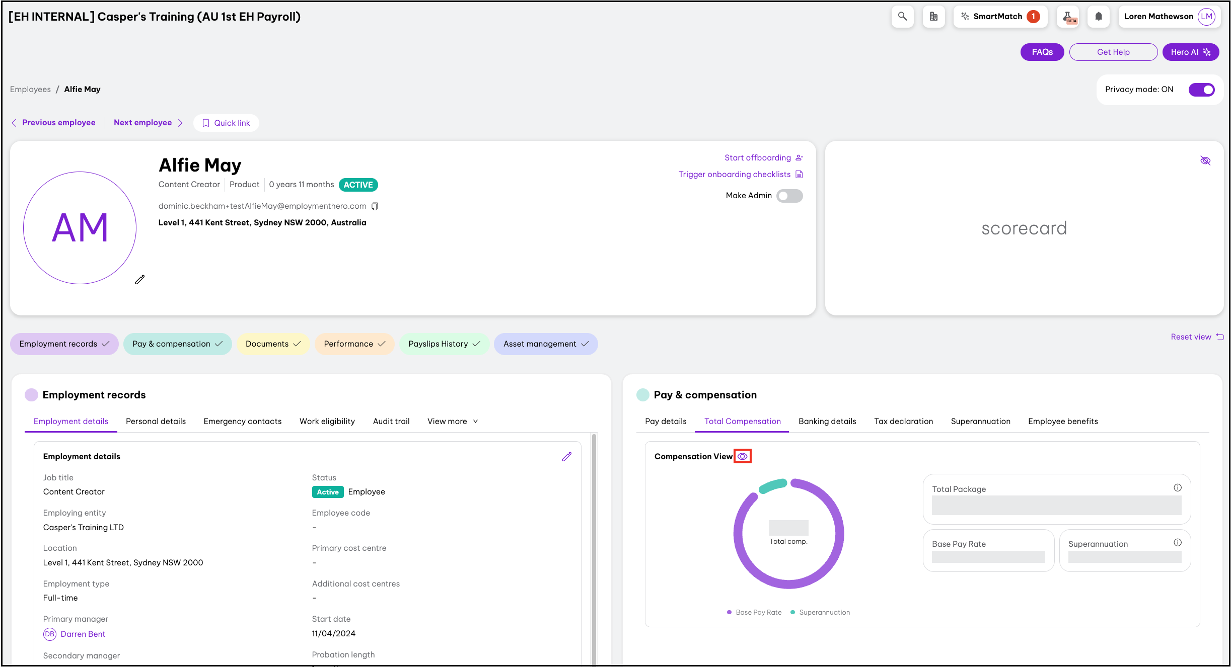 Admins can view each employee's total compensation package in their file. Admins can also assign managers view access via a custom security setting called "total compensation" - view only. See here for more information about custom security settings.