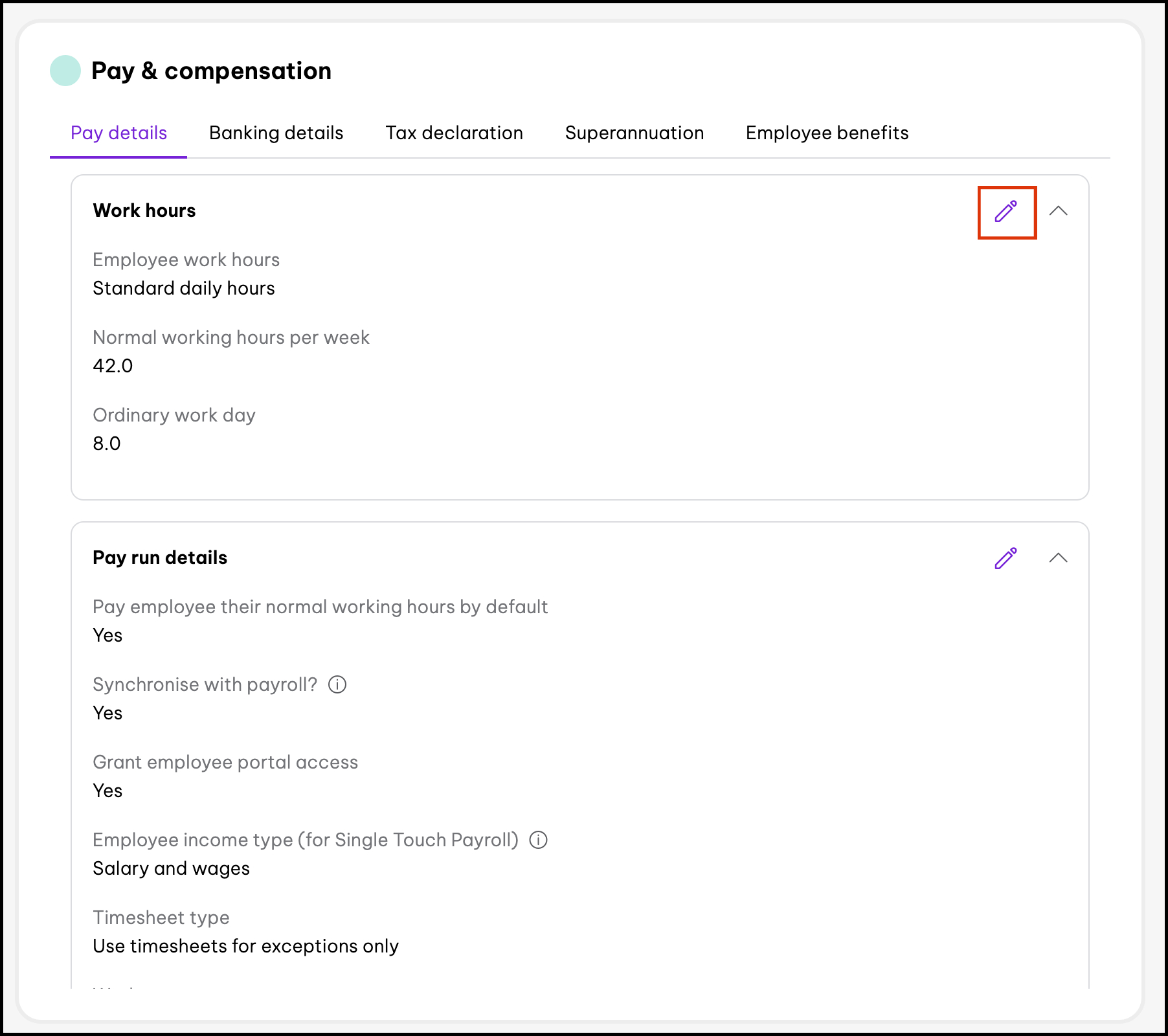 The Pay Rate, Superannuation, and Pay Category fields are only editable if you are not using an industrial award. If entering a 'per annum' pay rate, please make sure the rate you enter is exclusive of superannuation. Superannuation will be applied on top of the pay rate listed.