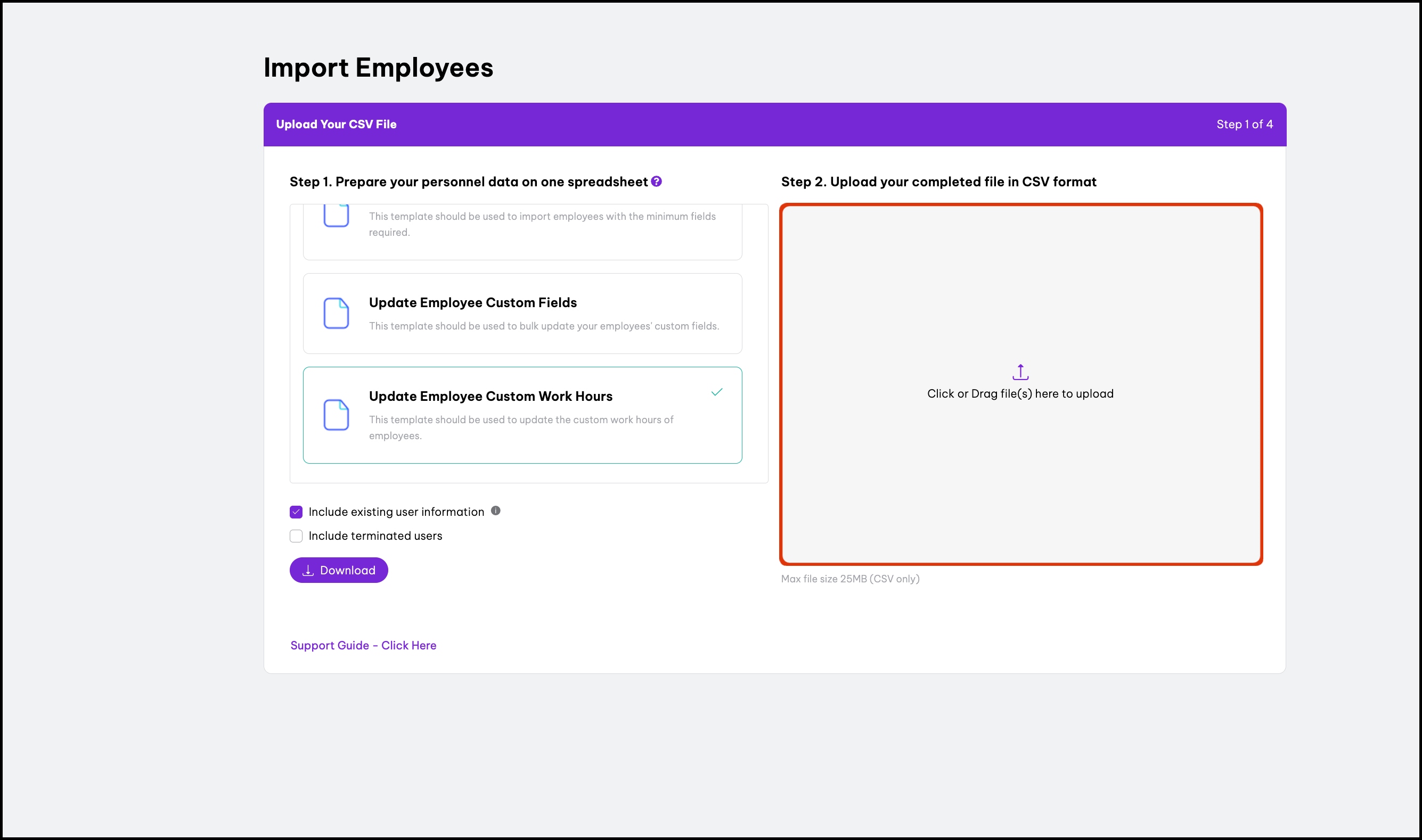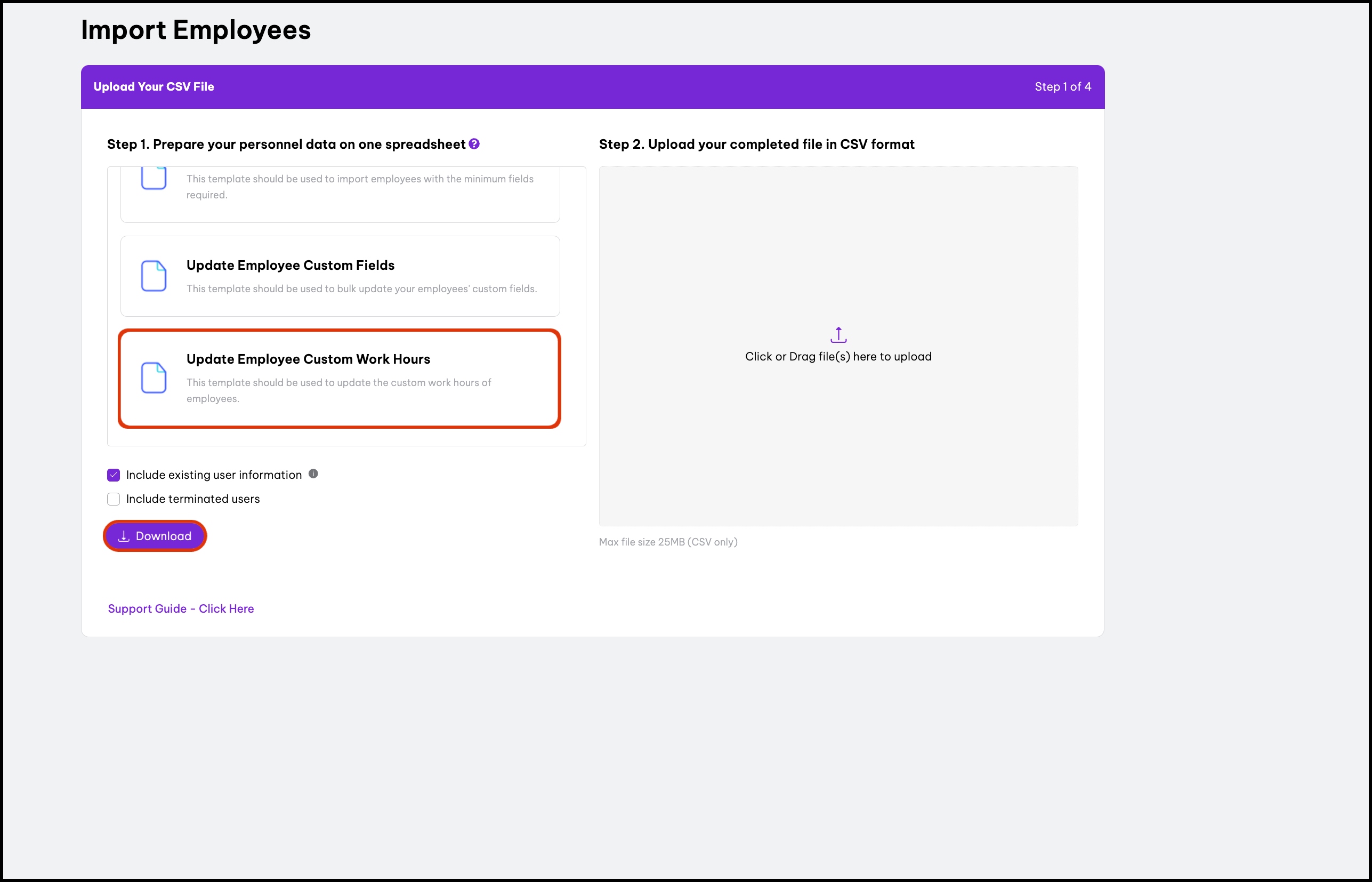 screenshot of Import Employees page, highlighting Update Employee Custom Work Hours button and Download button