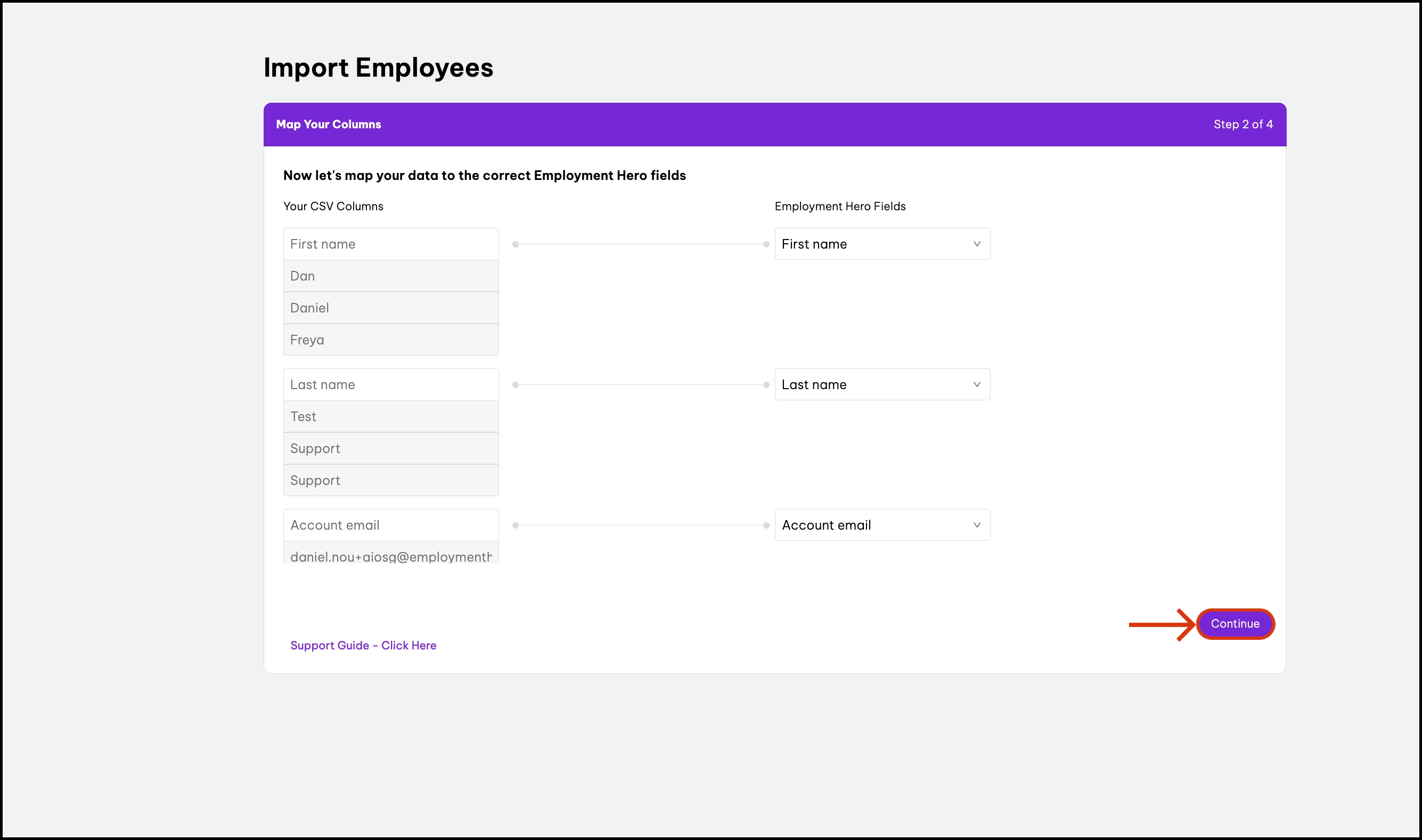 7. Once you have ensured your data has been correctly mapped on the Map Your Columns window, click the Continue button.