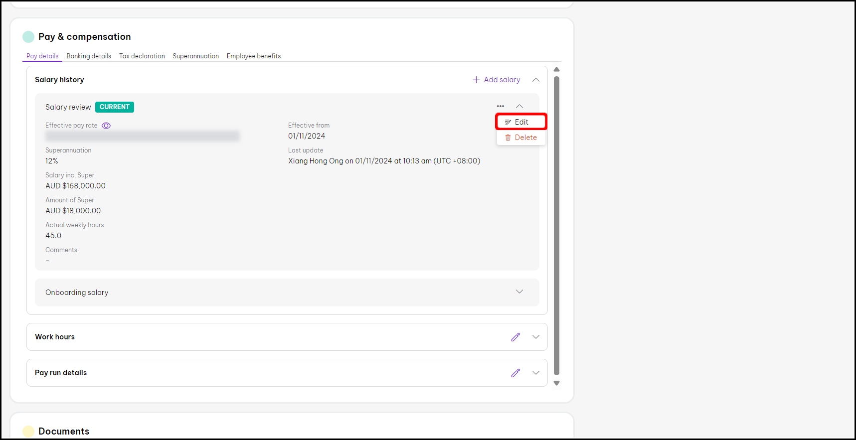 The Salary History feature lets you update an employee's salary, assign the correct leave allowance template, leave category, and pay schedule. The Pay Run Details feature helps you determine whether employees need to submit timesheets and sync their data with your payroll platform. It also displays the user's timezone in the "Last Updated" section and accounts for daylight saving. The Work Hours feature records an employee's work hours, allowing you to set standard weekly hours, daily totals, or customise hours based on work type and daily hours over up to eight weeks.