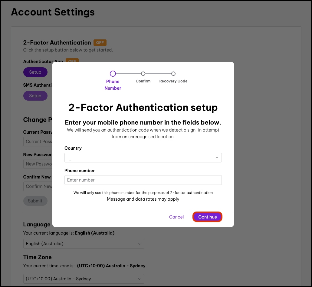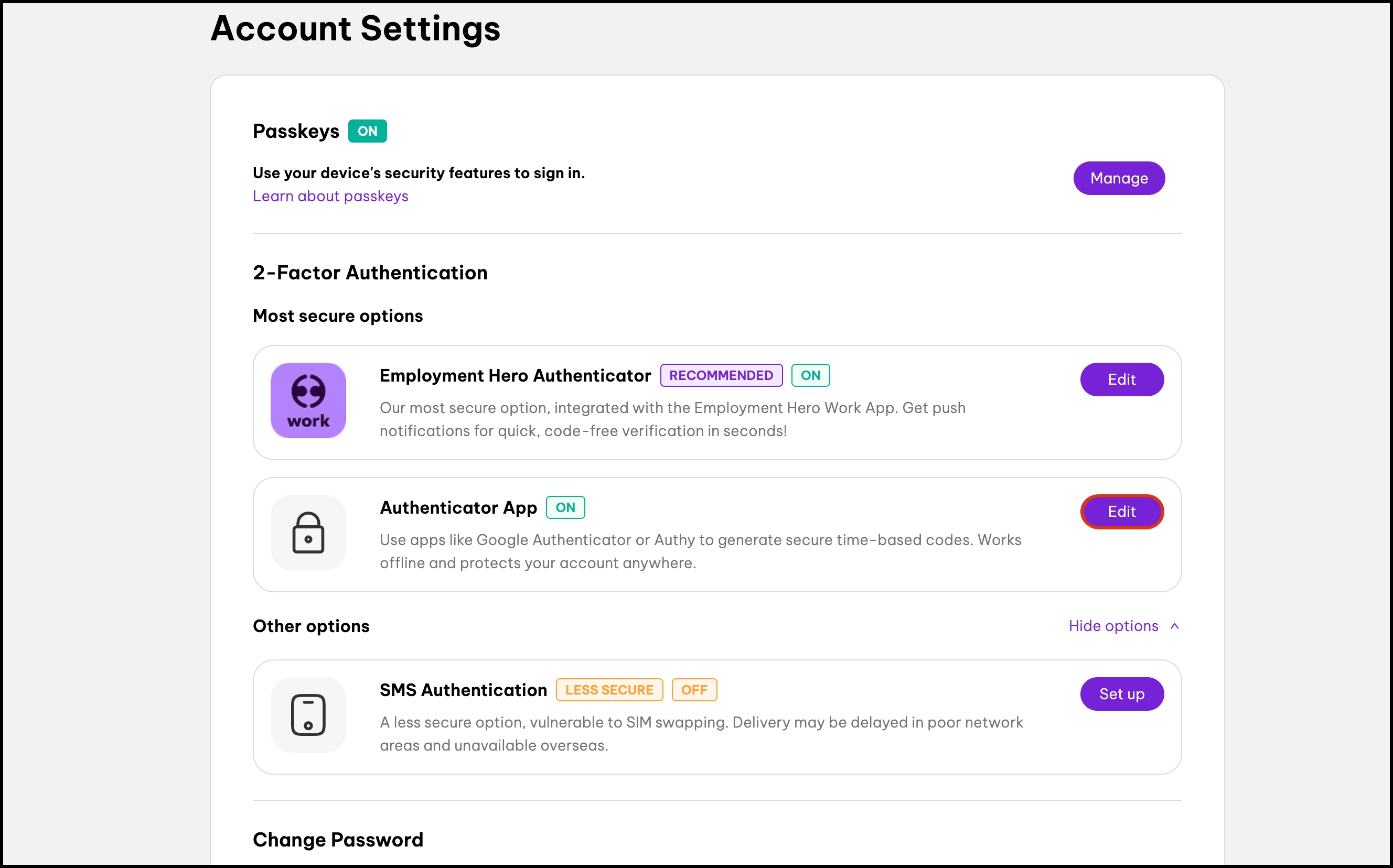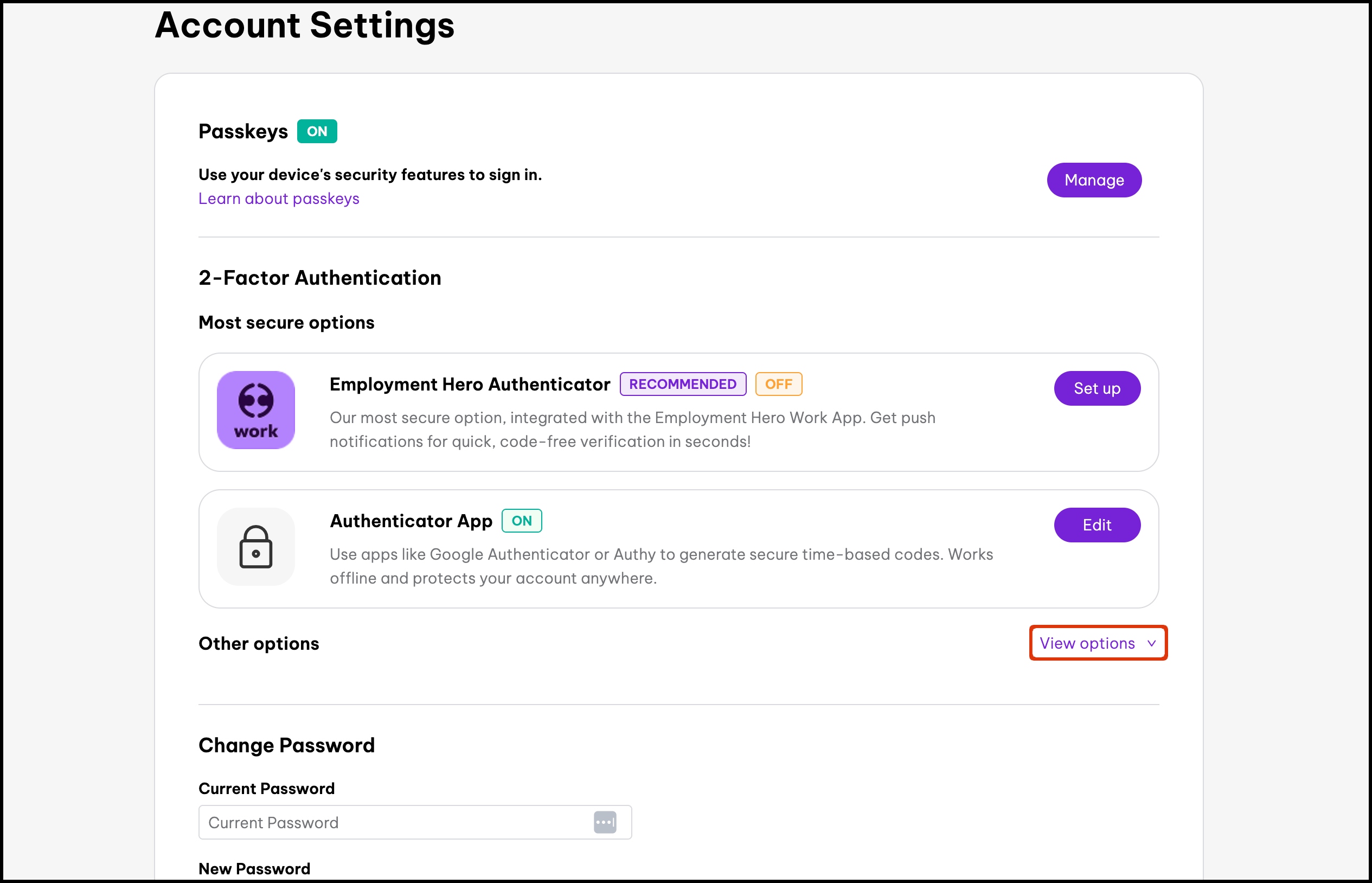 Employment Hero uses 2FA to help keep your account secure. This article explains how to set up 2FA using an authenticator app or an SMS-based authentication method to receive the required passcode. For more details on enabling 2FA for your employees or organisation, refer to this article.
