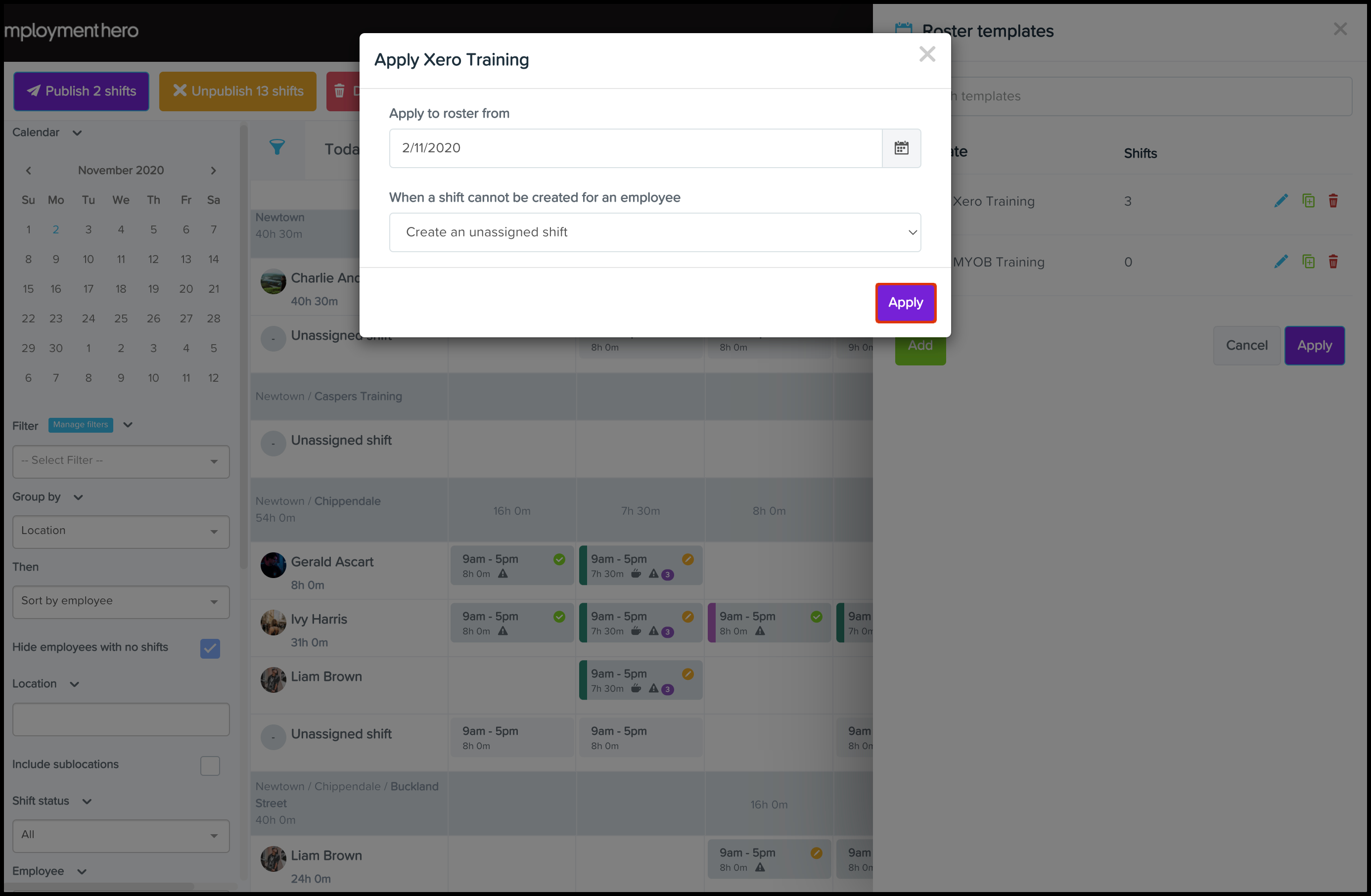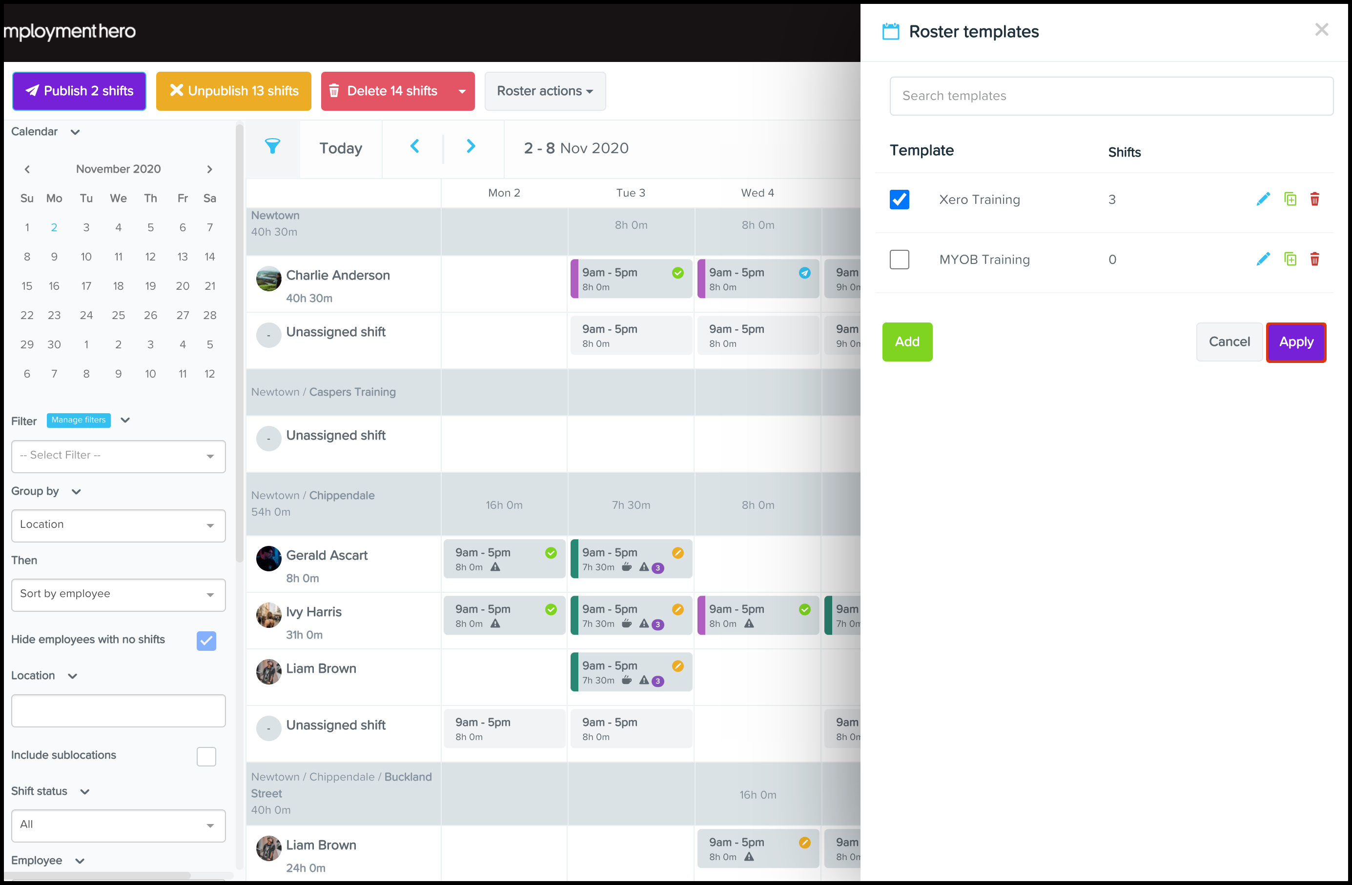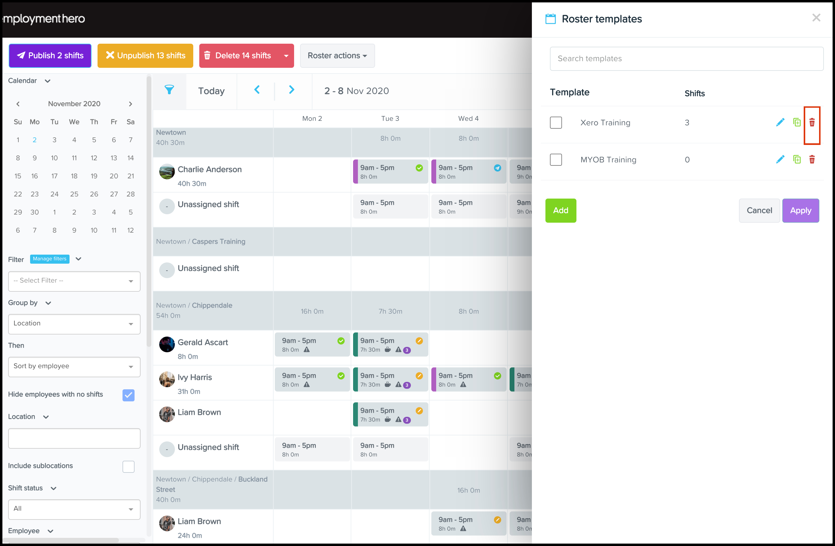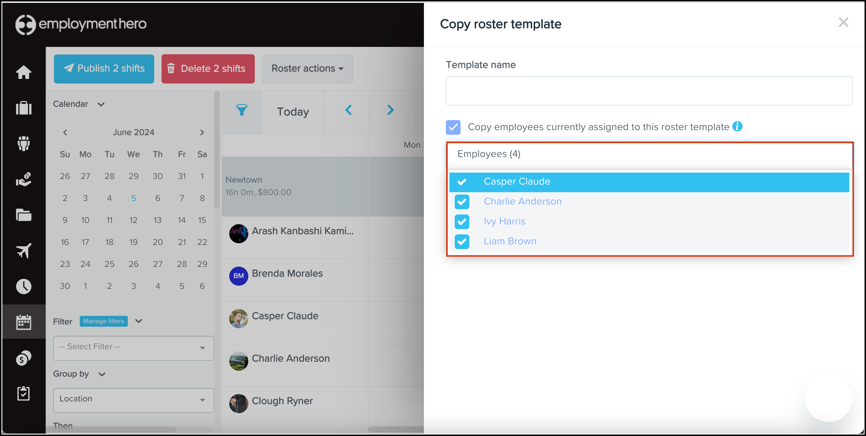 Under this option, there will be an Employees drop-down menu where all employees included in the template will appear. All employees will be selected by default, and then you can deselect individual employees from being included in the copied template if required.