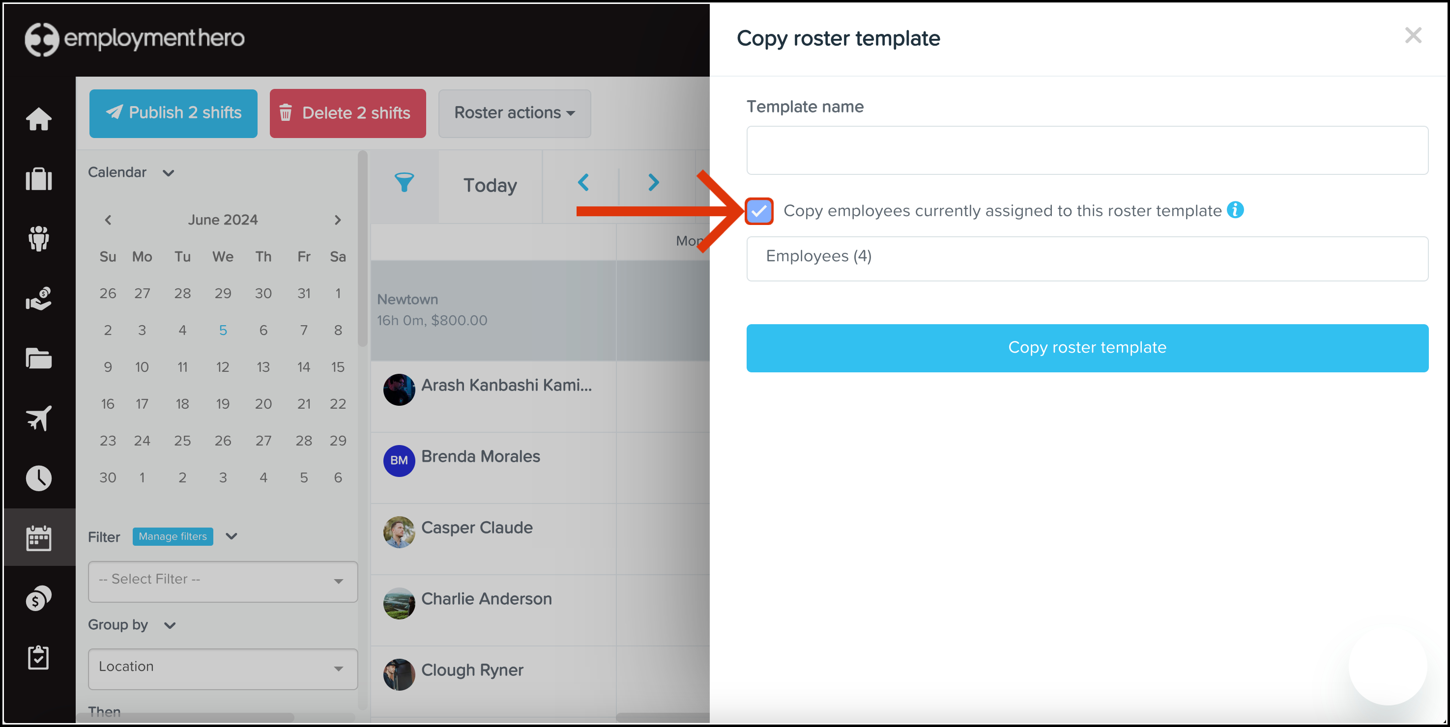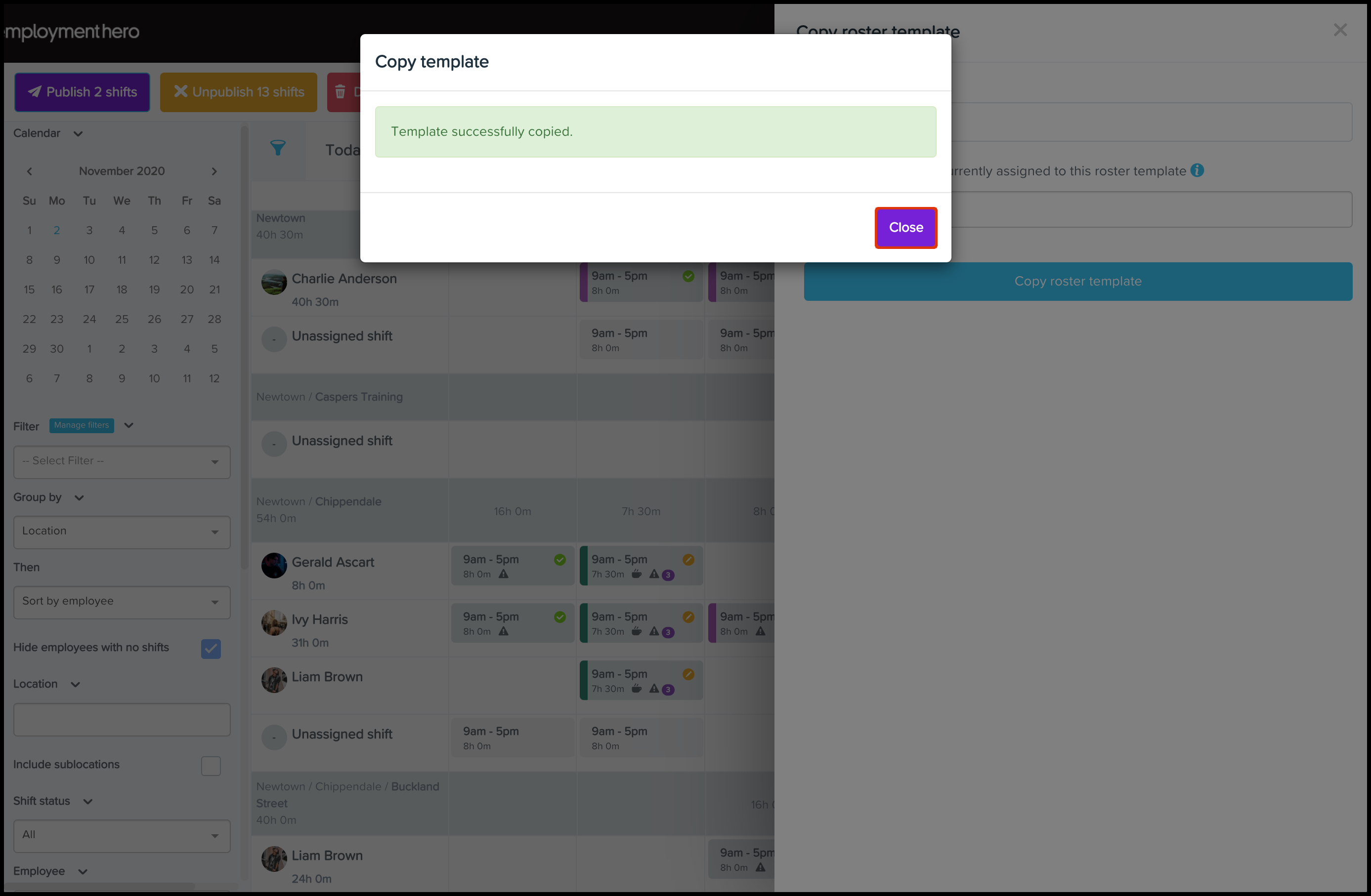• Copy roster template: Once you have completed the above steps, click 'Copy roster template' to complete the process and duplicate the template.