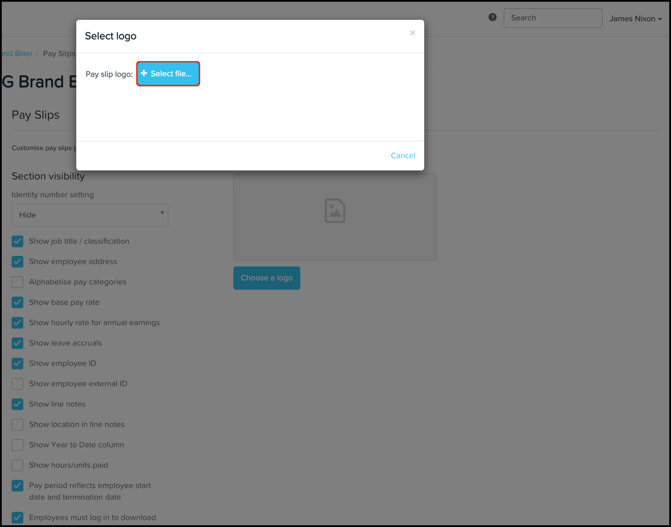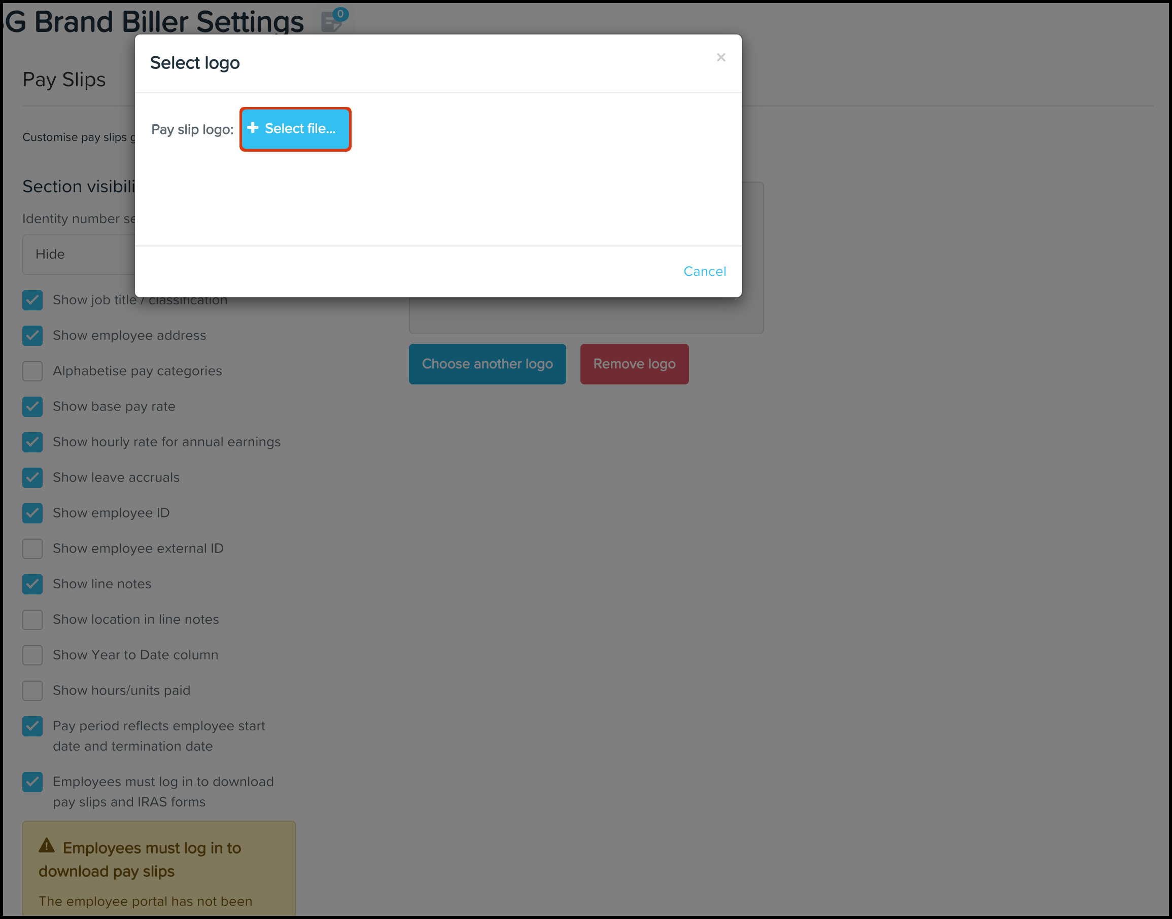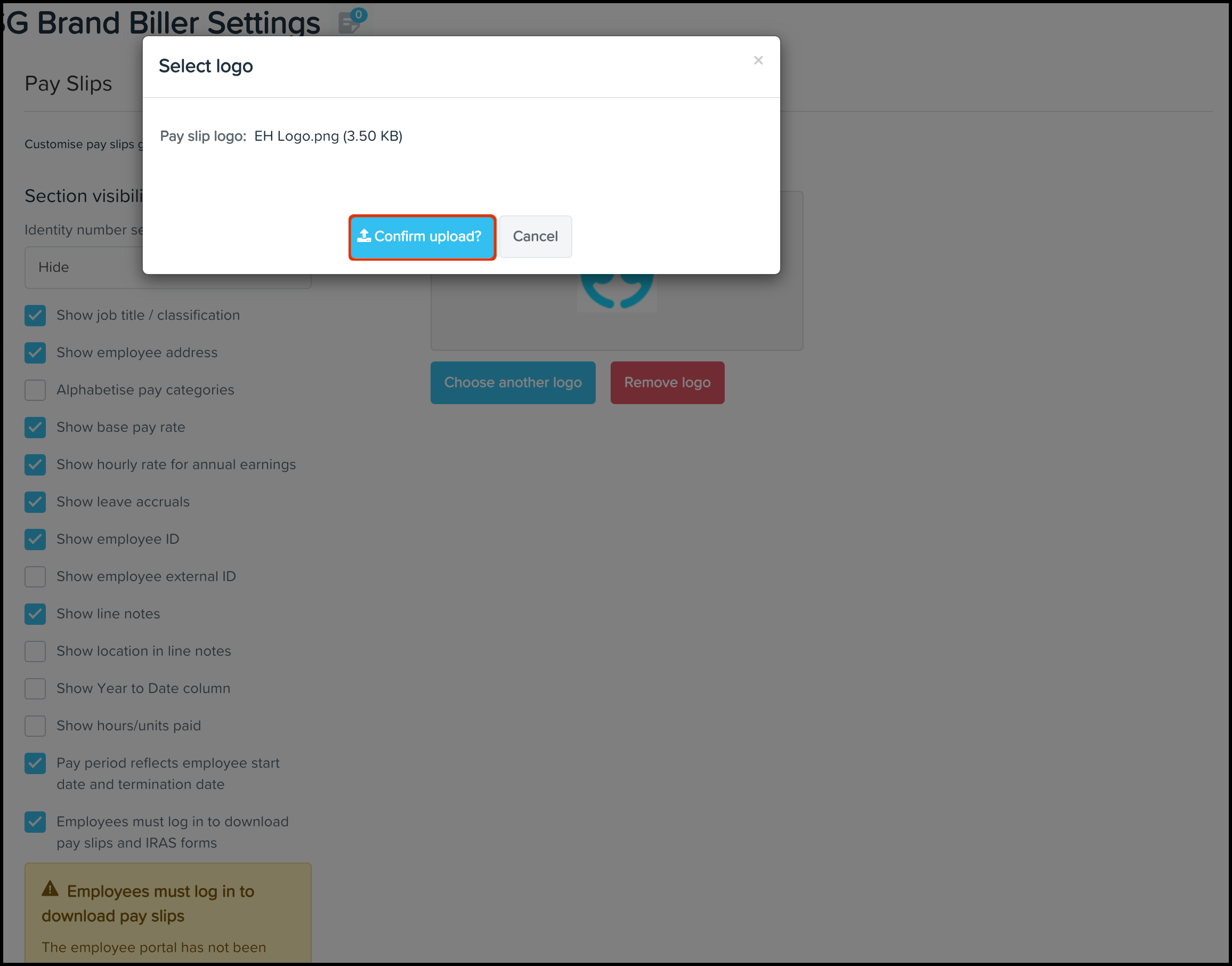 For customers with an HR and Payroll connection, please ensure that you upload a logo for this to appear on the payslip on the HR platform.