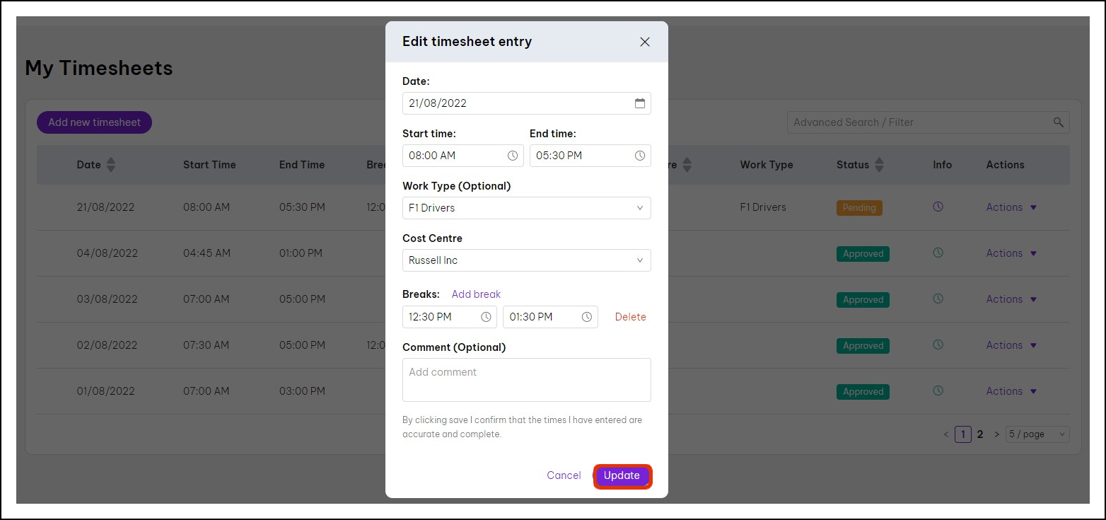 With the My Daily Start and End Time Based Timesheets feature, you can log your start and end times, record breaks, and add comments. You can also edit or delete entries if needed.