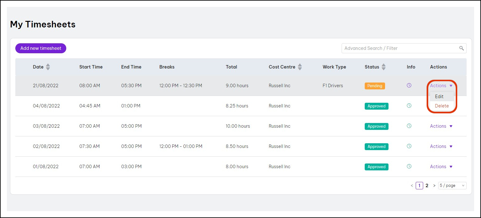 | Red clock | Used for approved timesheets that has not synchronised with Employment Hero Payroll. | |