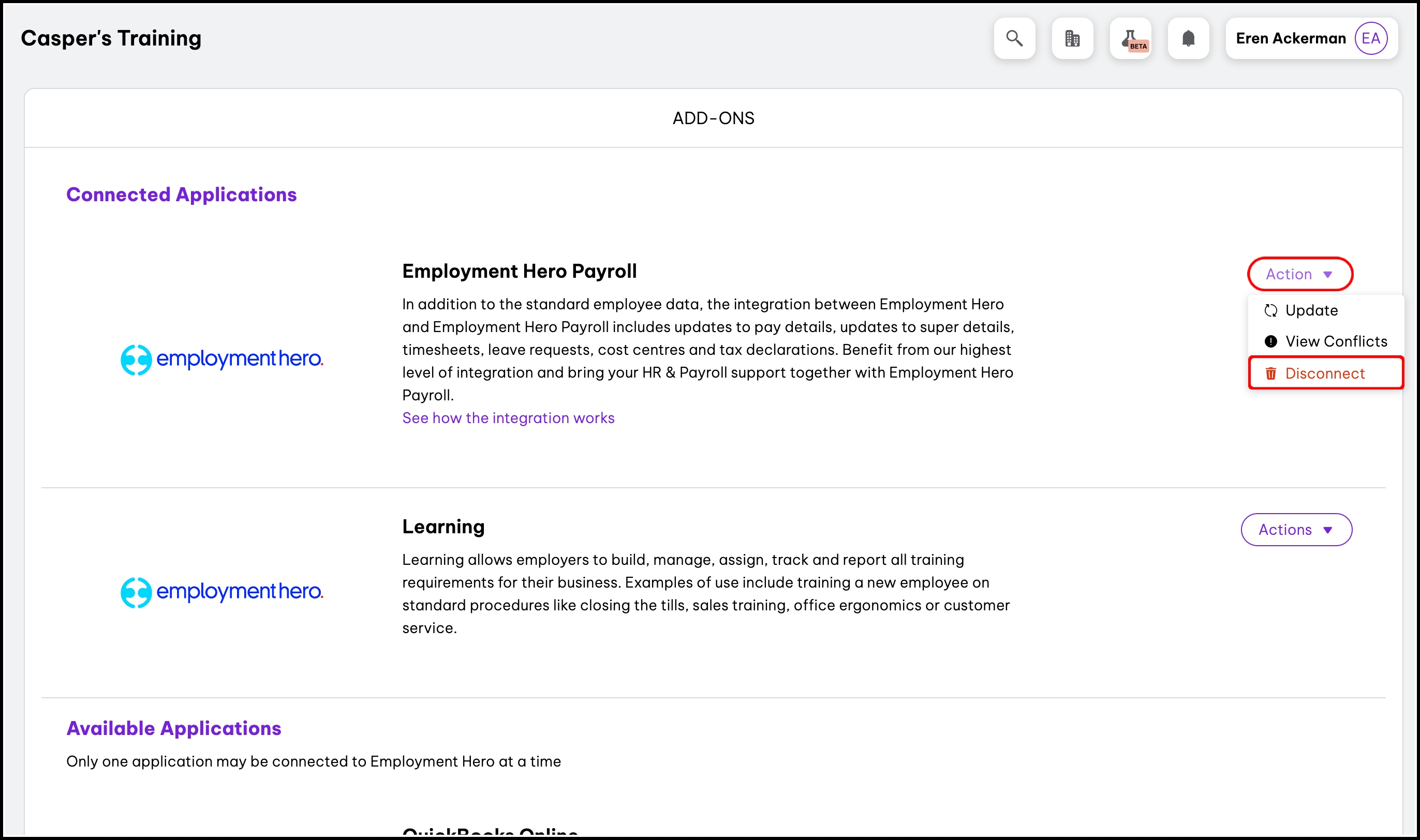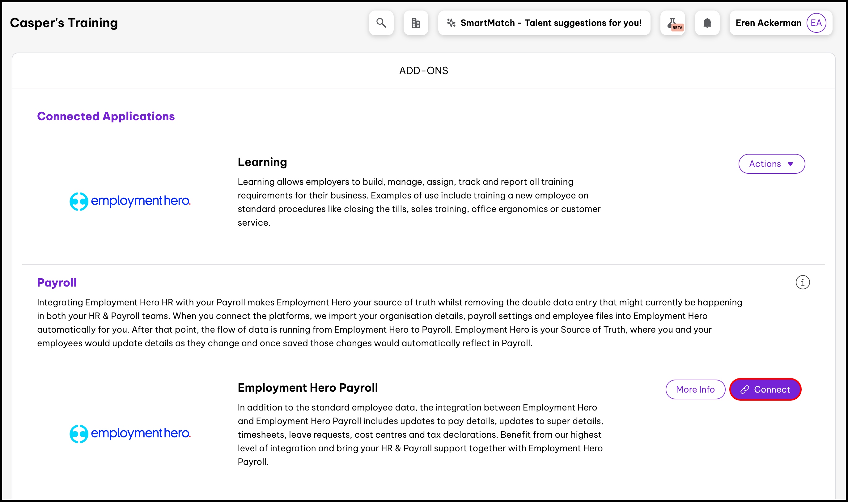 - Click the Connect button for Employment Hero Payroll.