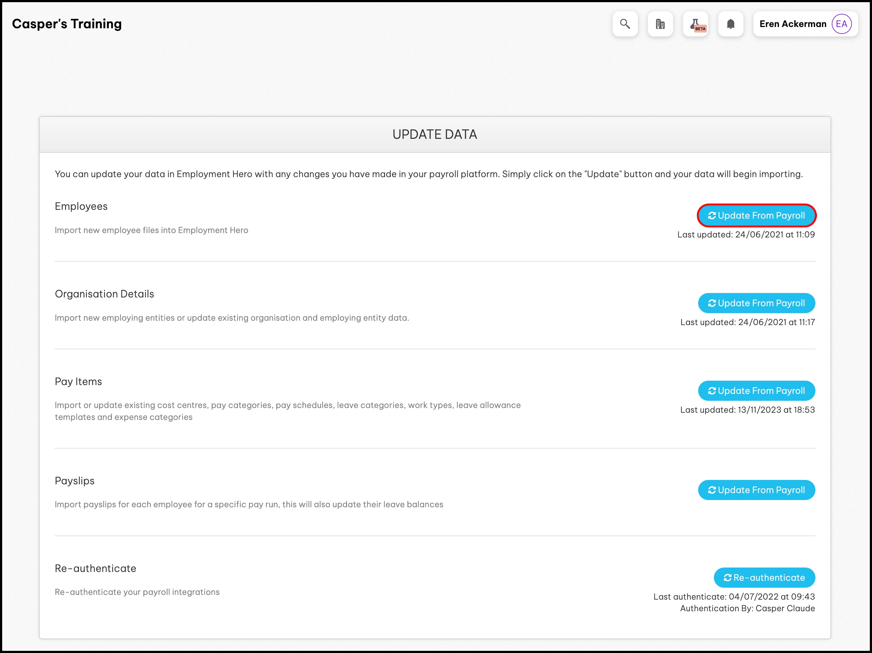 - In the Employees section, click the Update From Payroll button.