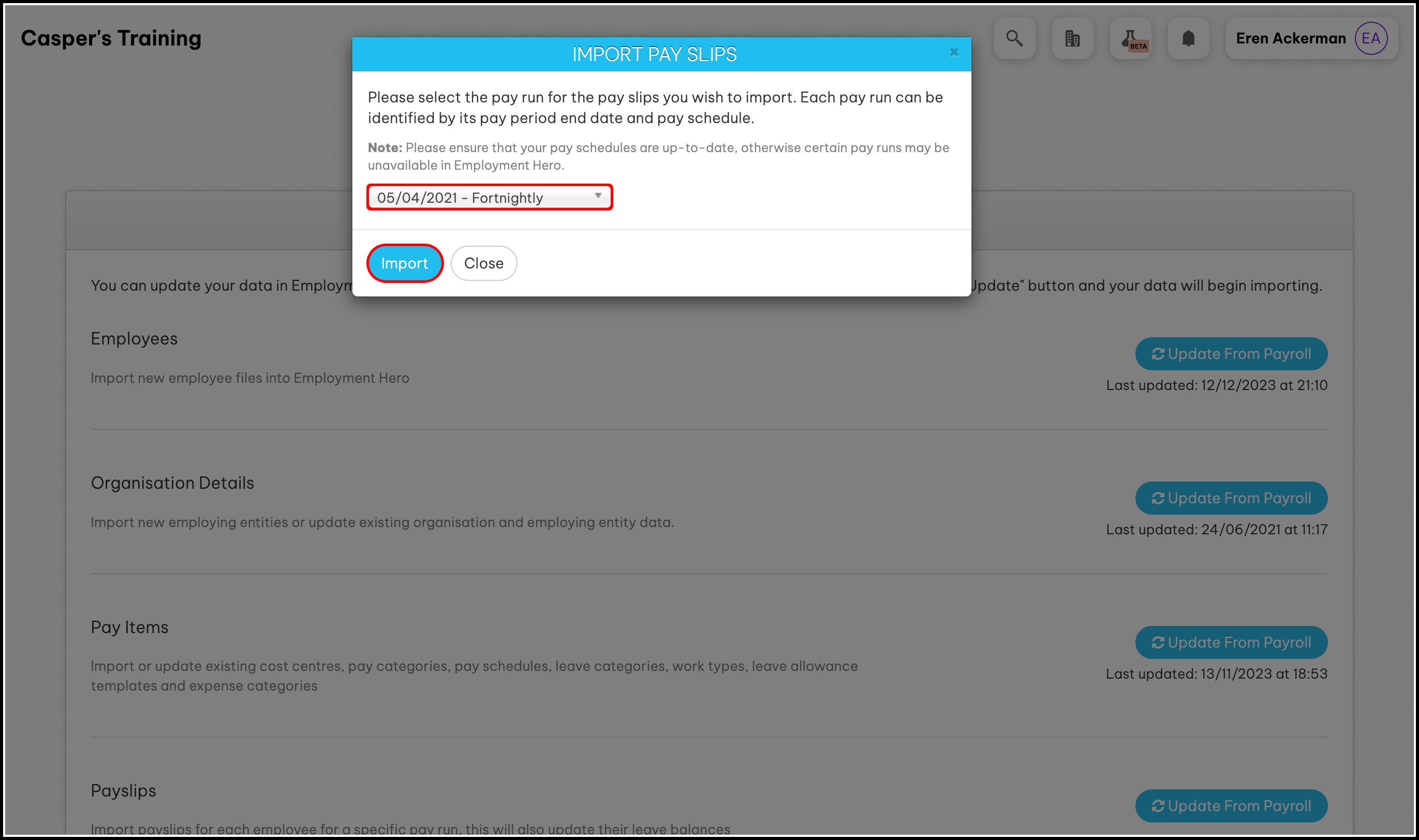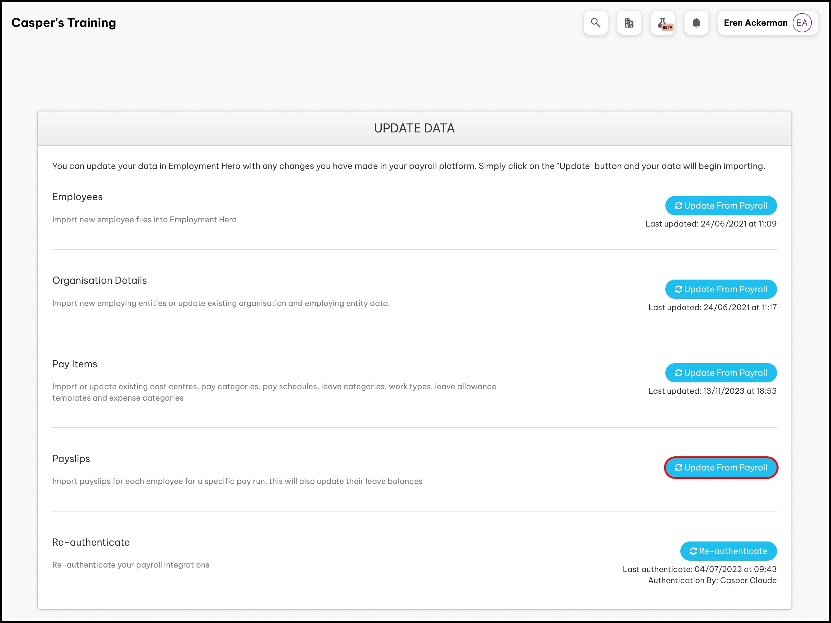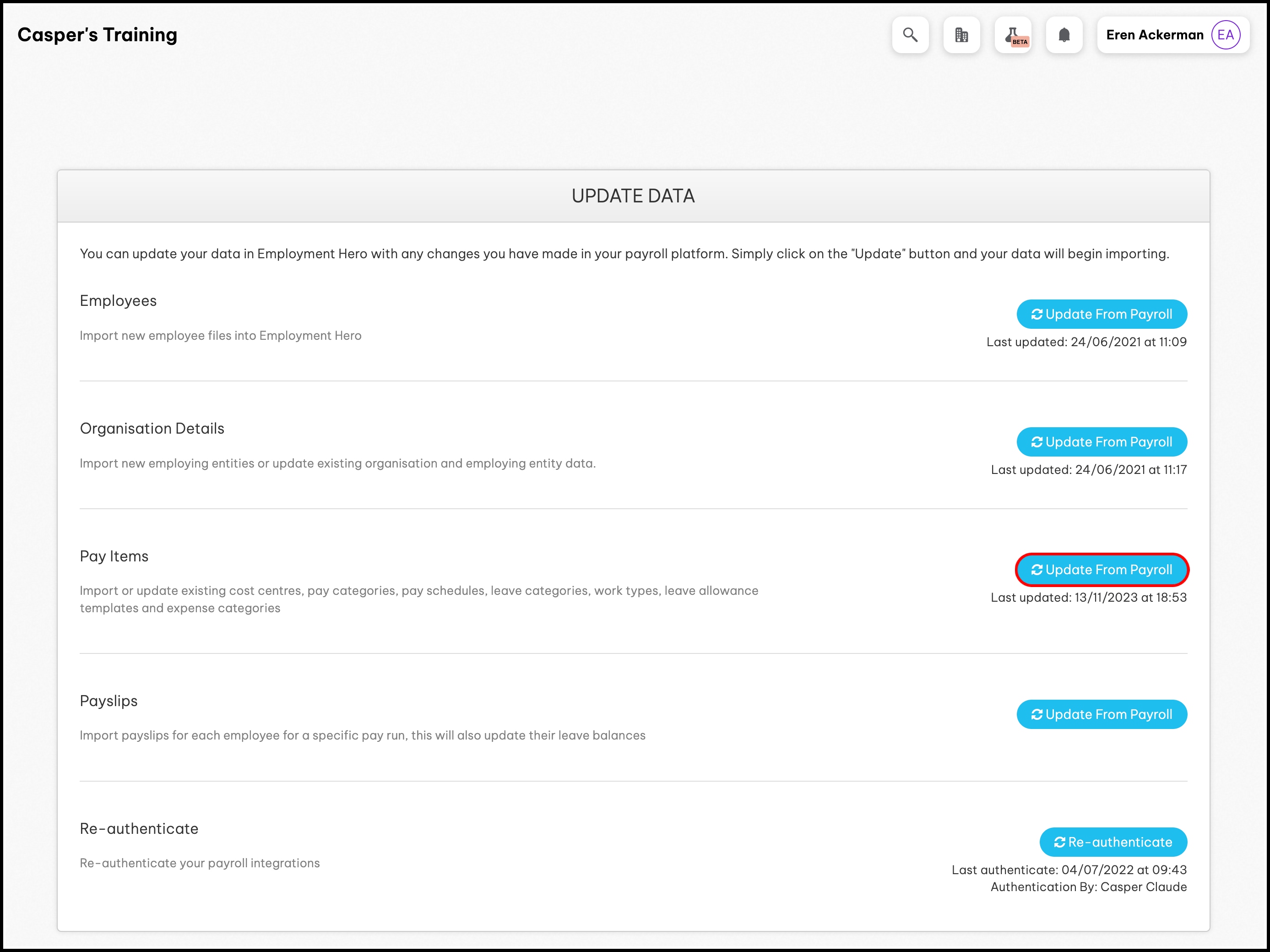 The Update From Payroll button for the Pay Items section will turn into a green Updated button. This means the HR platform has successfully imported your pay items from your payroll platform.