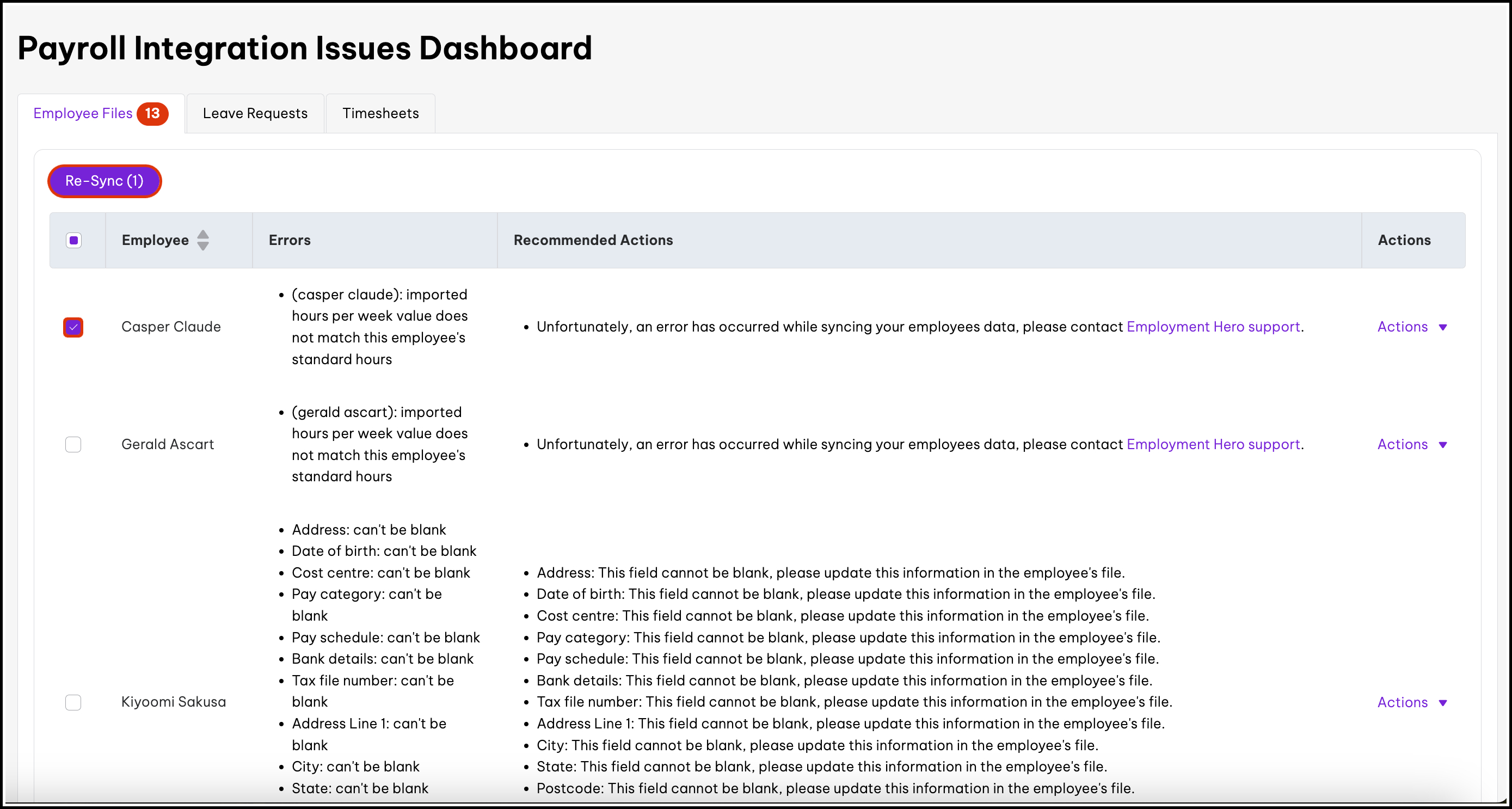 - HR platform: Payroll integration issues dashboard This feature displays your organisation's sync errors broken down into three areas: employee file, leave requests, and timesheets.