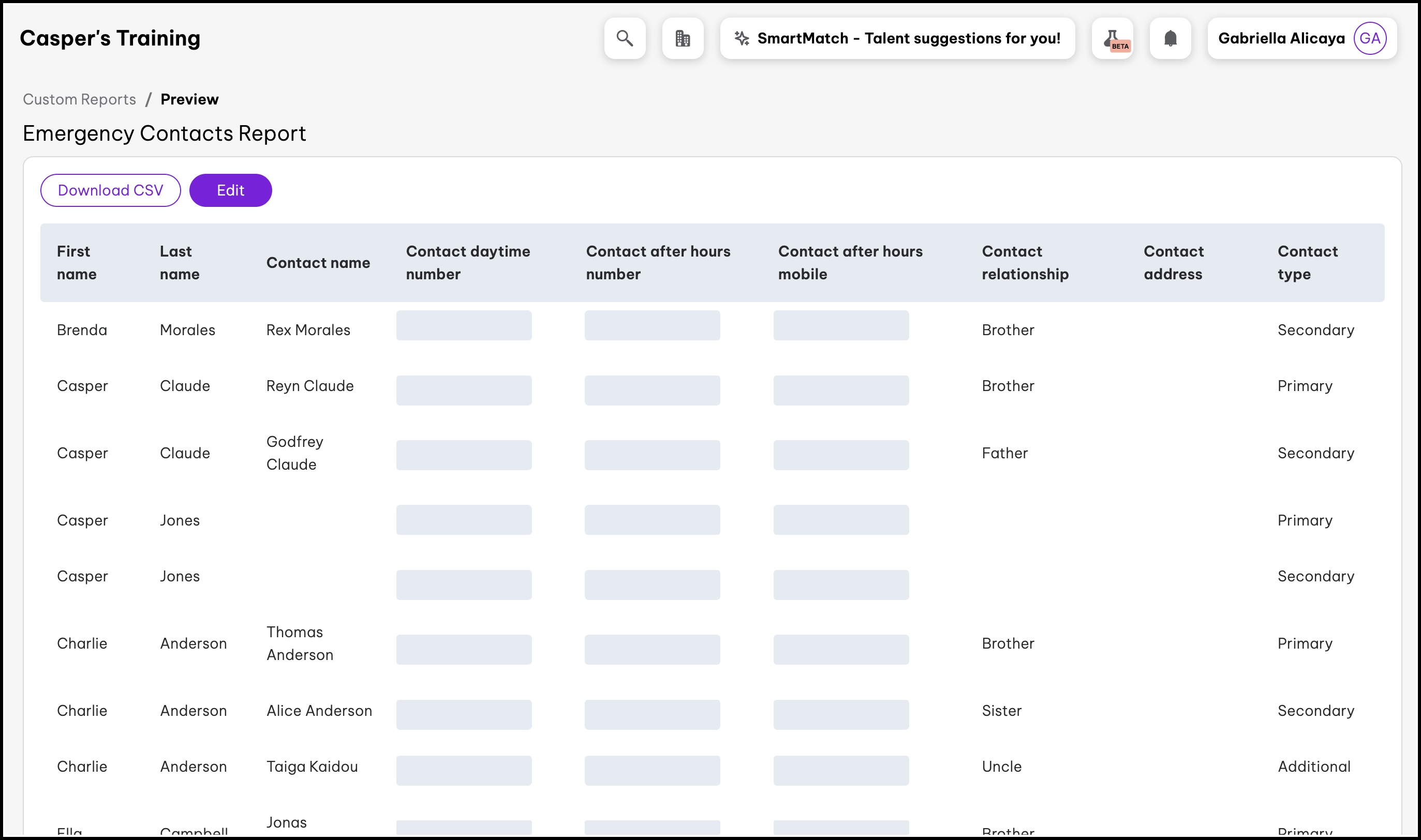 You will now see your emergency contacts report on your screen. To read more information on how to edit, download, and delete a custom report, refer to the following article.