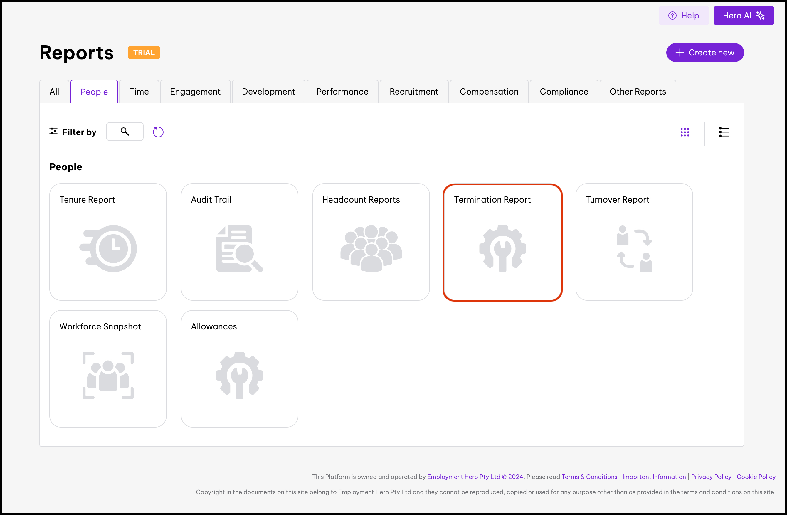 screenshot of Reports page, highlighting People tab and Termination Report button