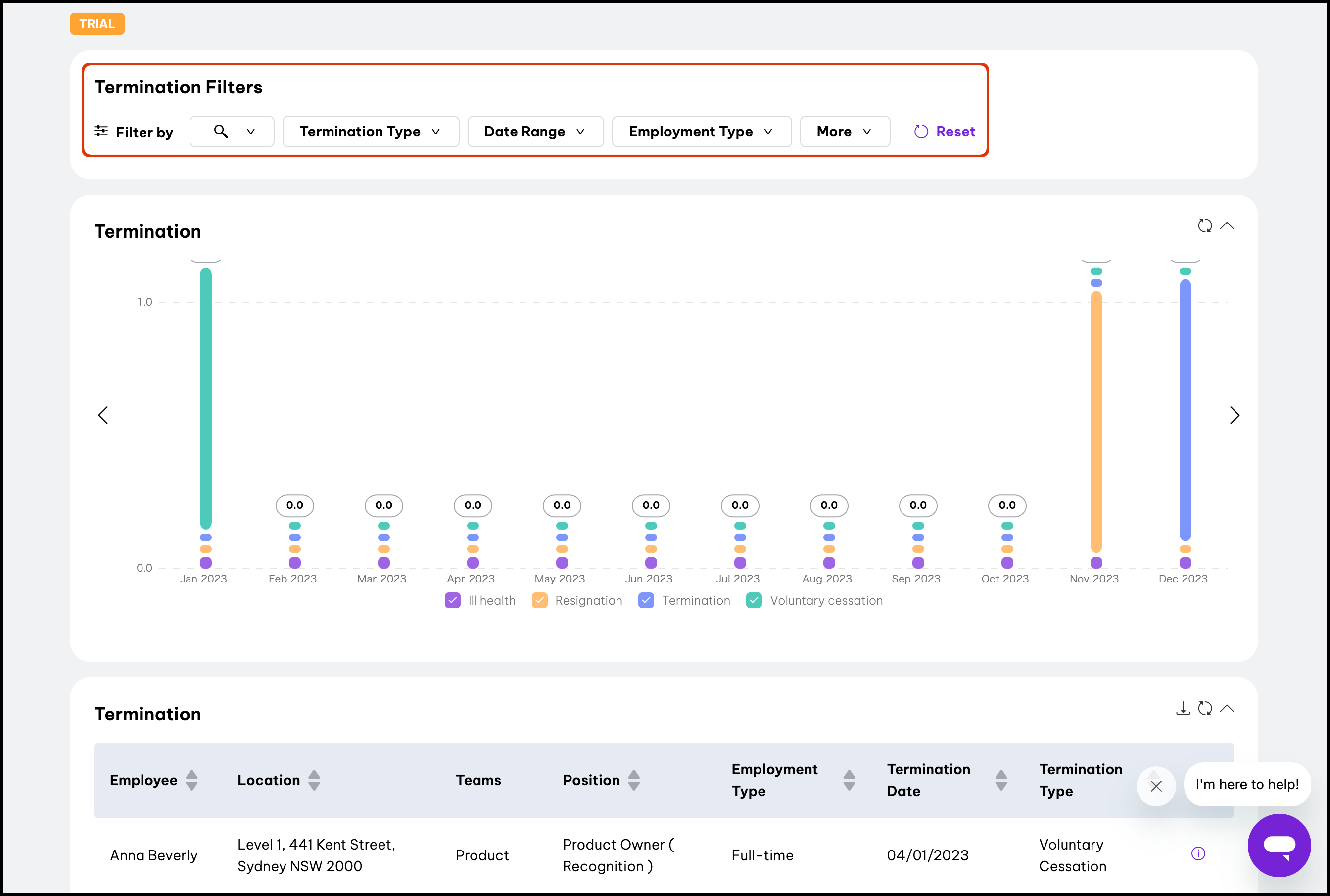The employee termination report also shows one termination record per employee record. If an employee is terminated, rehired, then terminated again, Employment Hero will only record that employee's latest termination date. In other words, the first termination date will not be reportable.